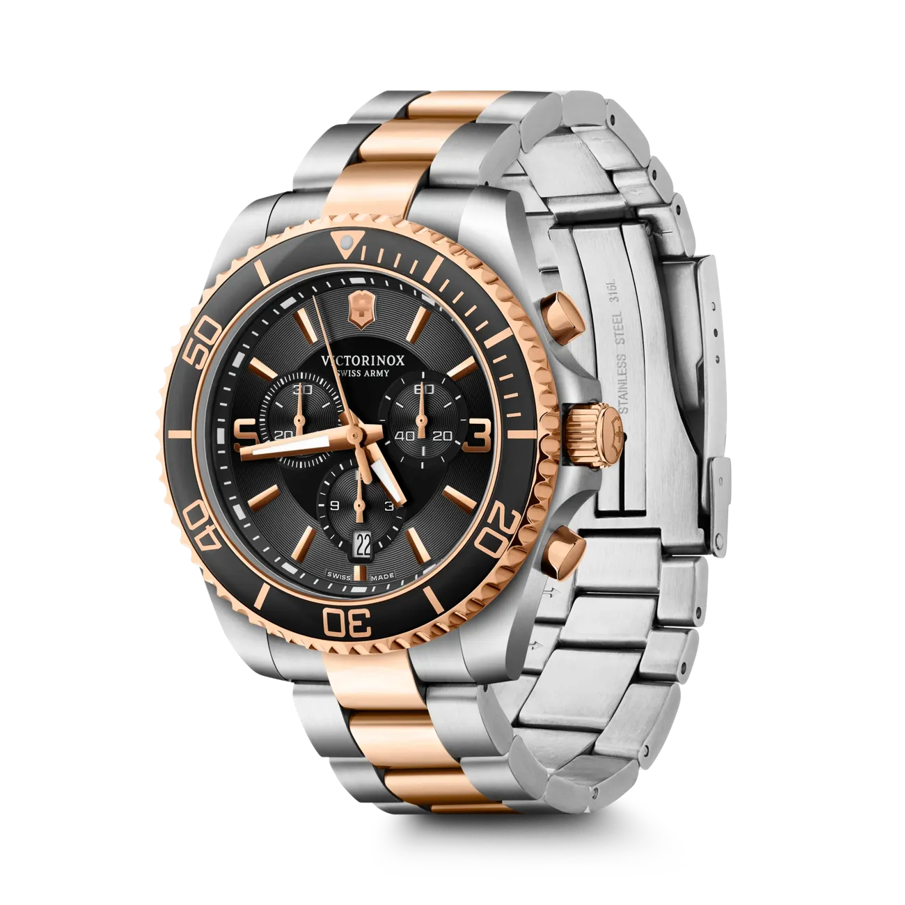 - Colore della cassa: Argento, Colore della lunetta: Oro rosa, Colore del quadrante: Nero/Oro, Colore del cinturino o del bracciale: Argento/Oro rosa