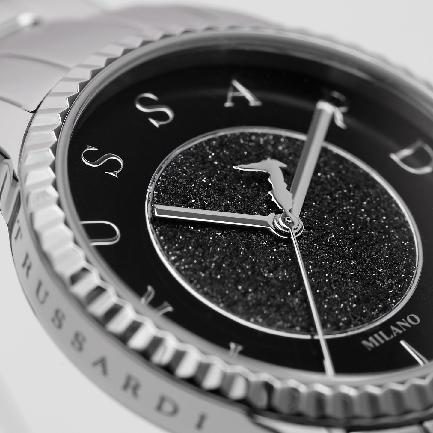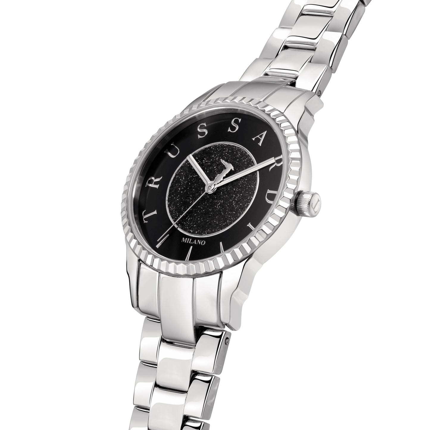 Orologio Donna TRUSSARDI della collezione T-BENT. Orologio con movimento MVT VJ21, funzione Solo tempo. 3H. Quadrante: 3 lancette UPMR, finitura Acciaio. lucido, colore NERO. POLVERE DI DIAMANTI. Tipo cinturino: Cap-Folded. Materiale cinturino: Bracciale in Metallo di colore Acciaio. Cassa in Vetro minerale di dimensioni 32. Chiusura: Fibbia DEPLOYANTE con pulsanti. Resistenza all'acqua: 5 ATM. Peso: 81,3 gr. Codice prodotto: R2453144503. Materiali: Acciaio. Confezione: scatola originale TRUSSARDI. Garanzia: garanzia internazionale TRUSSARDI