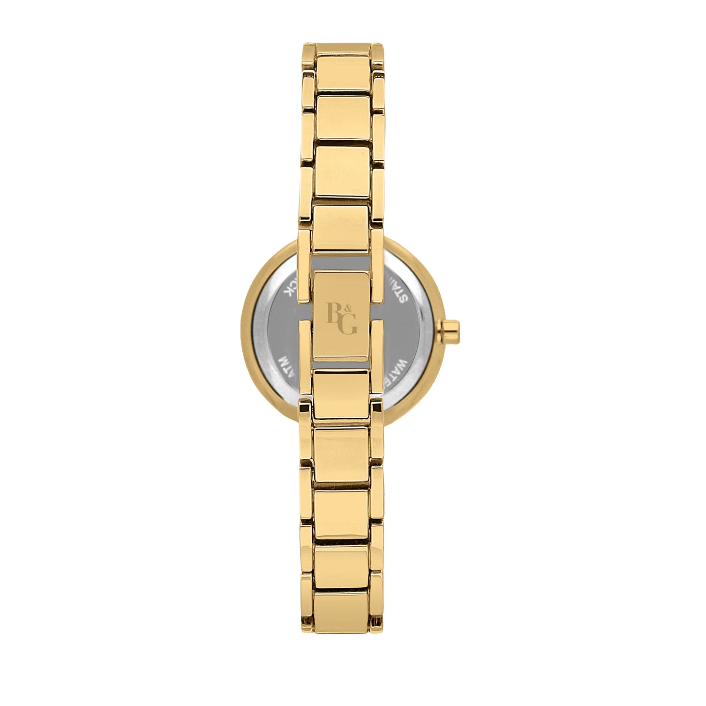 Orologio da donna del brand B&G della collezione Bangle. Orologio rotondo, in lega con vetro minerale. Funzioni: solo tempo, 3H. Resistenza all'acqua di 3 ATM. Misura cassa: 28.50mm. Il colore del cinturino è oro. La referenza è: R3853312504. Confezione: Scatola originale B&G. Garanzia Prodotto: Garanzia Internazionale B&G