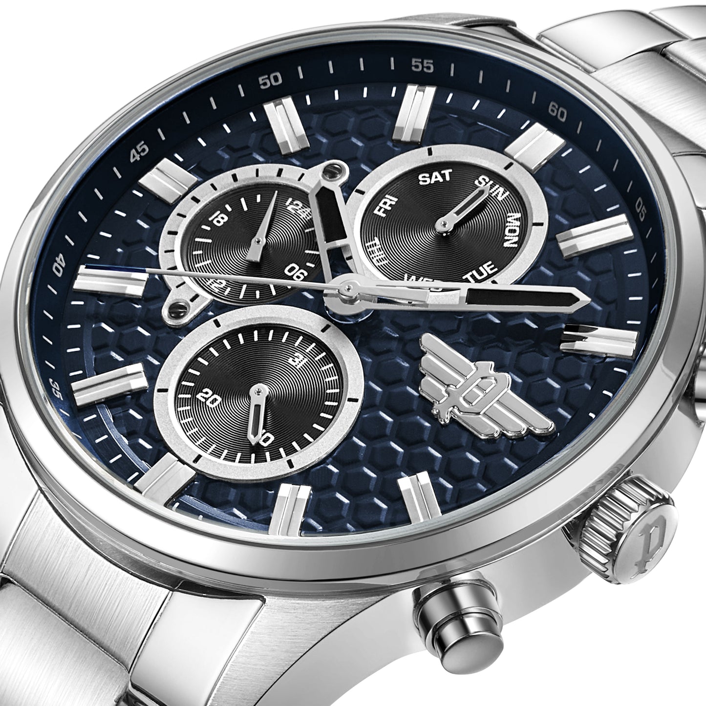 Orologio Uomo Police Tauriko PEWJK2229405. Orologio Analogico da Uomo con movimento Al quarzo, cassa in Acciaio inossidabile di diametro 45 mm, quadrante Blu, vetro Minerale e cinturino in Acciaio inossidabile di colore Argento. Caratteristiche: Multifunzione. Water resistant: 5 ATM