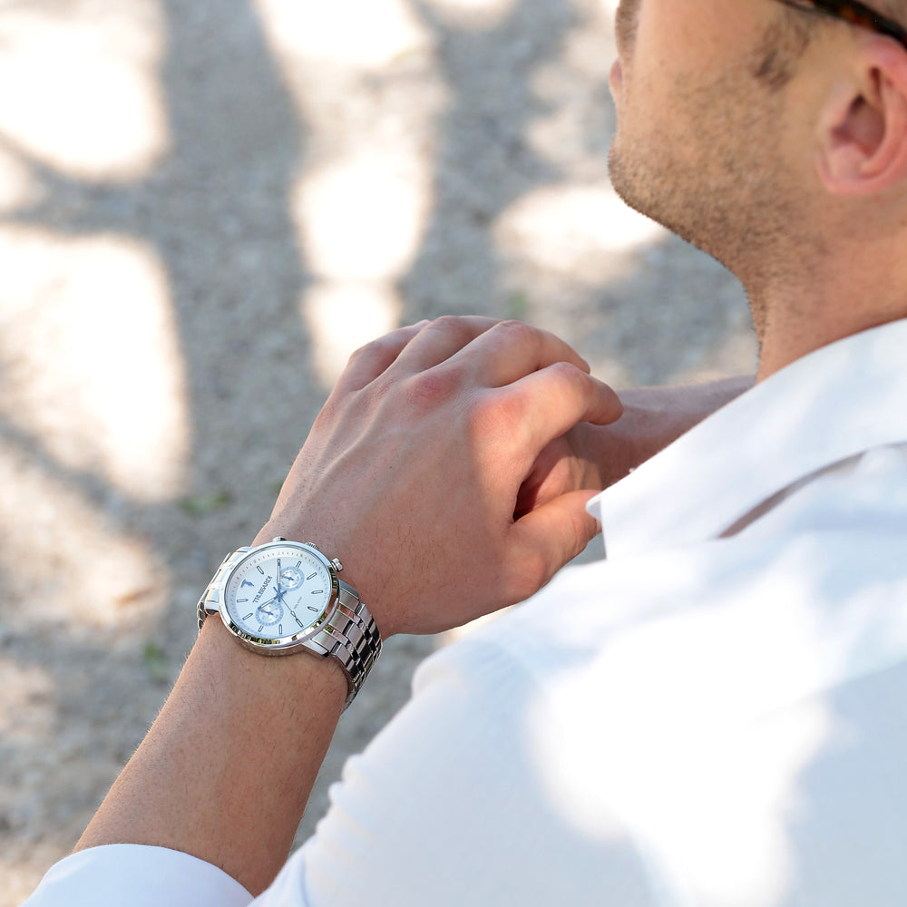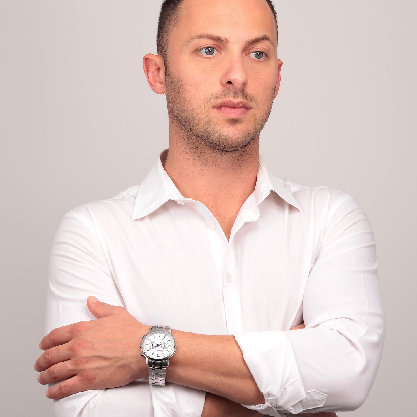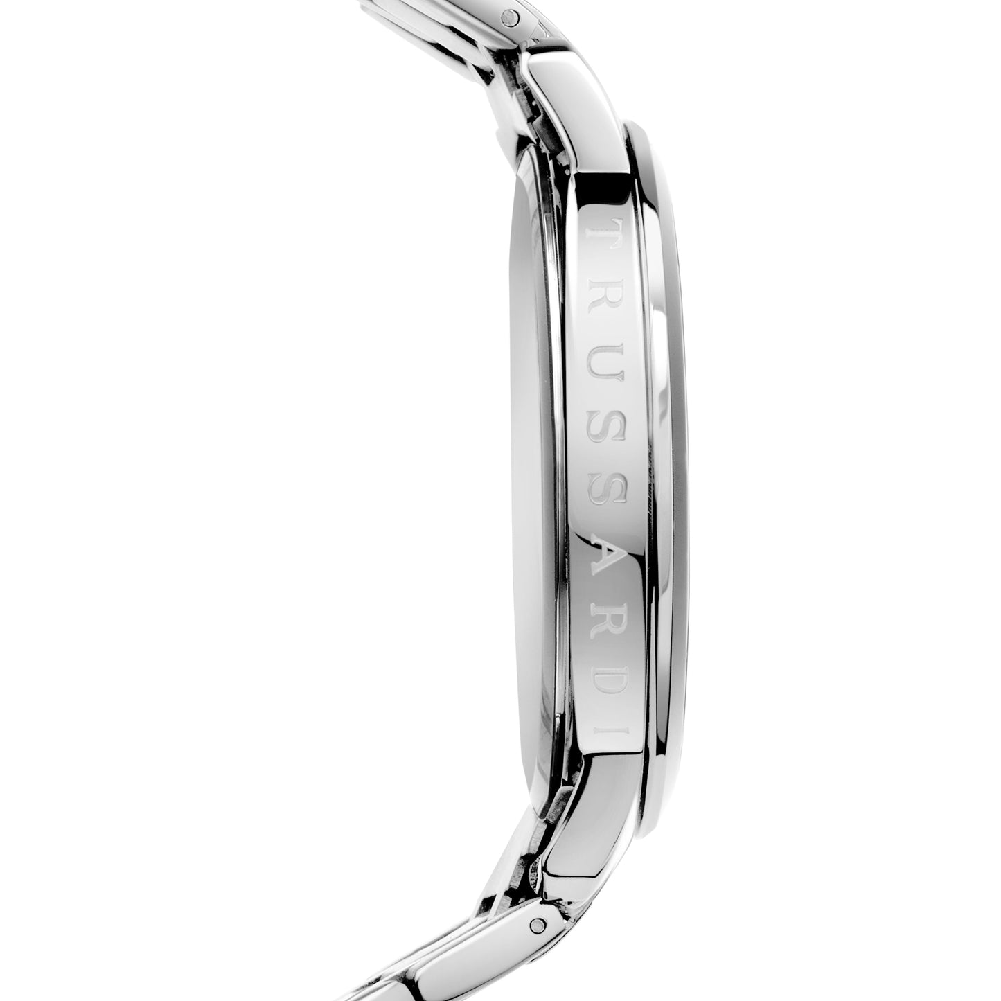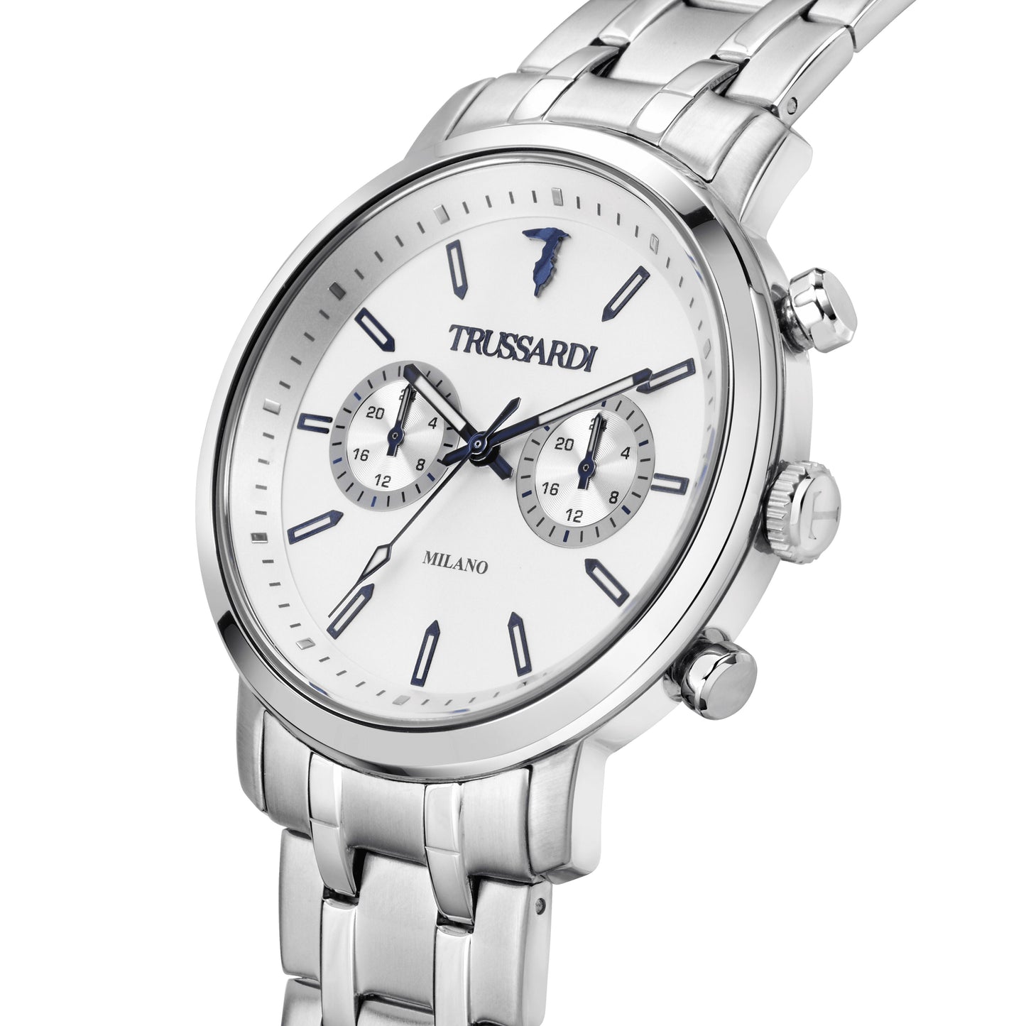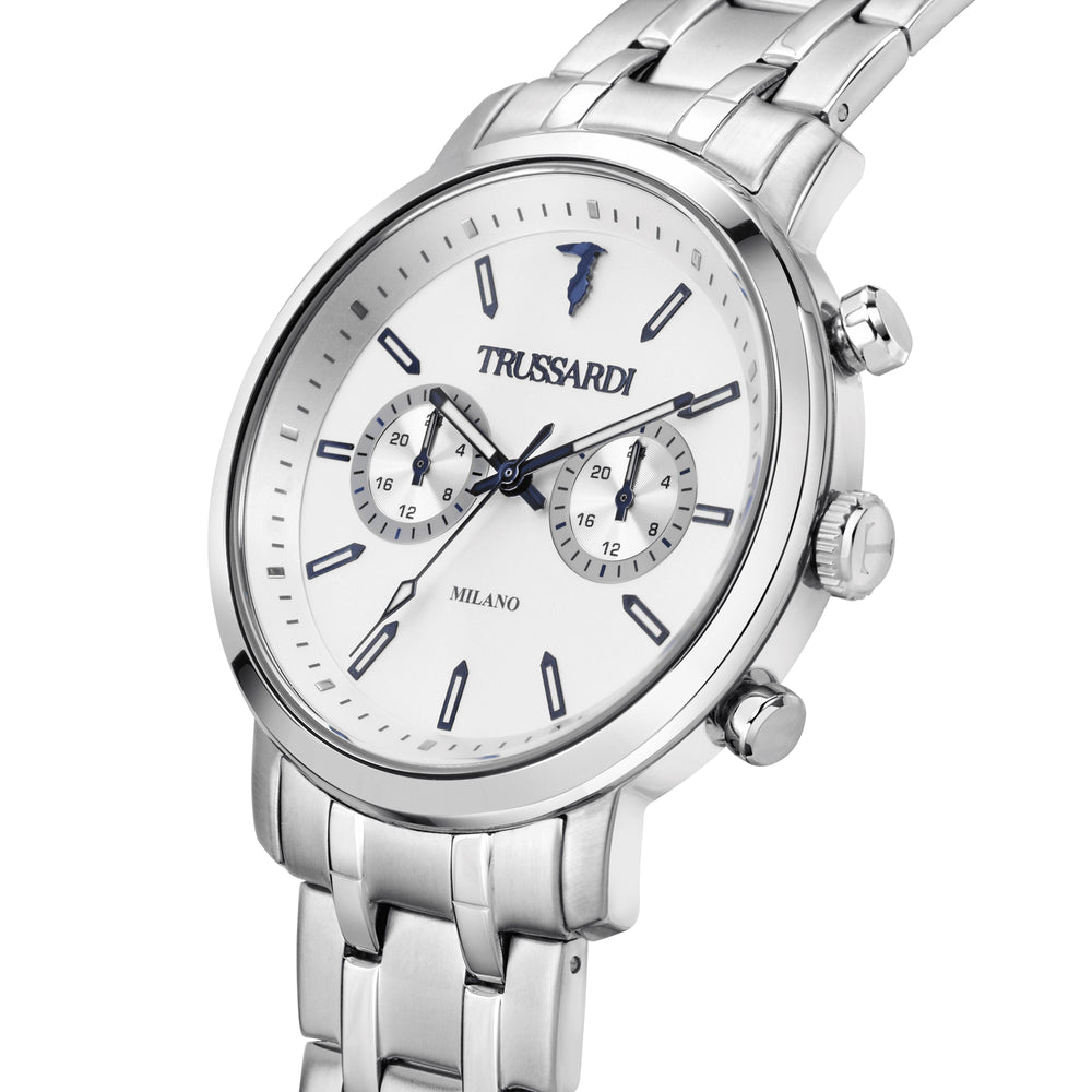 Orologio Uomo TRUSSARDI della collezione T-COUPLE. Orologio con movimento MVT SII VD32A1 5H STEM 3H, funzione Multifunzione. Quadrante: Multifunzione UPMR, finitura acciaio spazzolato e raffinato, colore BIANCO. Tipo cinturino: Cap-Folded. Materiale cinturino: Bracciale in Metallo di colore Acciaio. Cassa in Vetro minerale di dimensioni 43. Chiusura: Fibbia DEPLOYANTE con pulsanti. Resistenza all'acqua: 5 ATM. Peso: 134 gr. Codice prodotto: R2453147004. Materiali: Acciaio. Confezione: scatola originale TRUSSARDI. Garanzia: garanzia internazionale TRUSSARDI