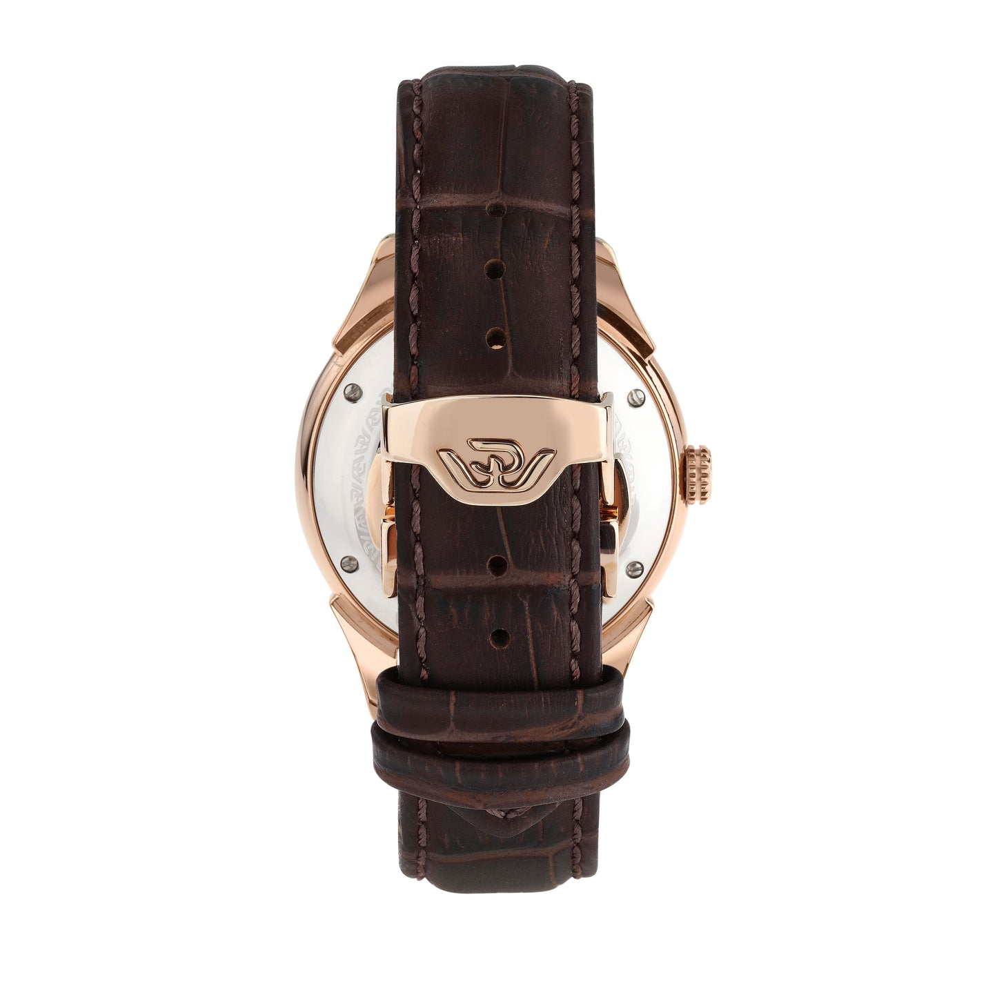 Men's Philip Watch Roma R8221217012. Men's watch with automatic movement with customized rotor and time-only functions. Rose gold-plated stainless steel case, 41 mm in diameter and 10.1 mm thick. Screw-down case back. White analog dial with visible movement, stick indexes and logo at the bottom. Durable anti-reflective sapphire crystal. Brown leather strap with crocodile print; deployment clasp with push buttons. Water resistant to 50 meters. Packaging: original PHILIP WATCH box. Warranty: PHILIP WATCH international warranty.
