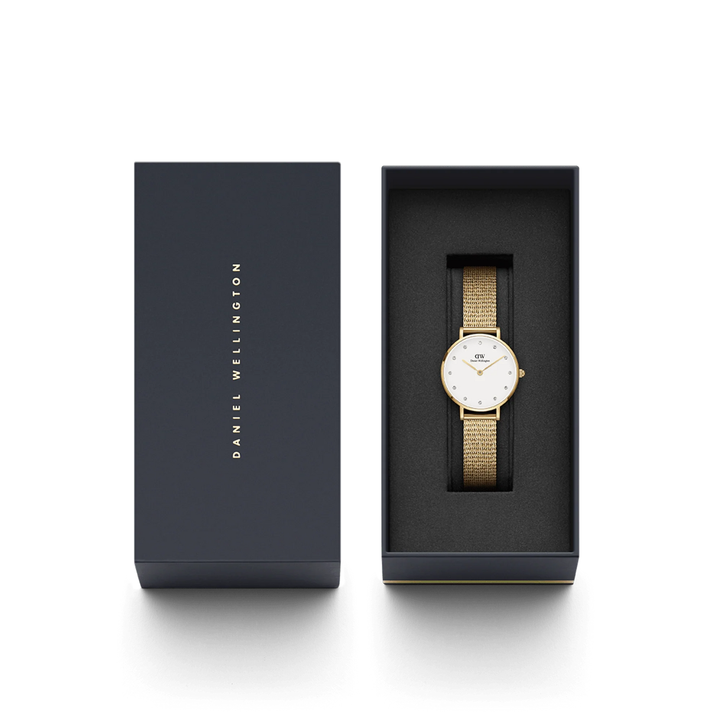 Daniel Wellington Petite Lumine Pressed Evergold Watch DW00100604. The Petite Lumine Pressed Mesh is a minimalist watch that prioritizes luminosity over excessive detail. The dial simply lights up from within, thanks to the small, luminous crystals arranged on the hands. Like a woven gleaming metal, the strap complements and adds even more sparkle to this extraordinary timepiece. Choose your preferred brightness from three available colors.