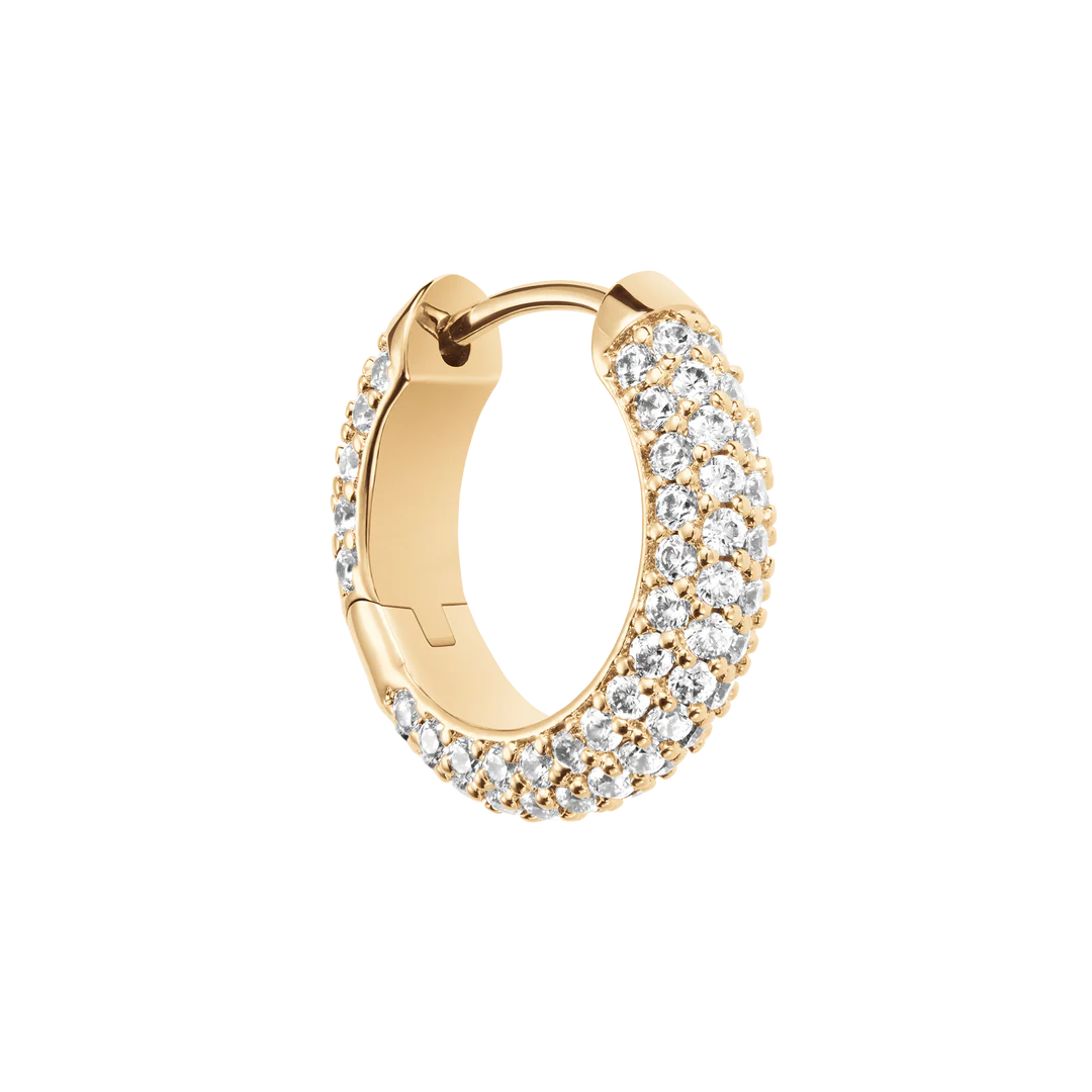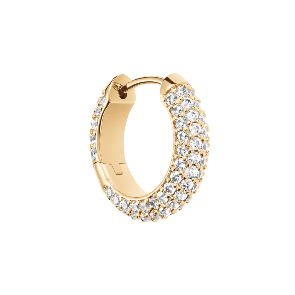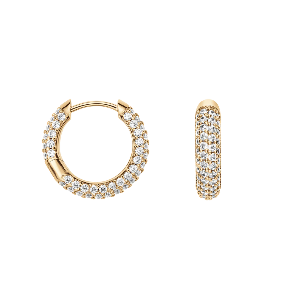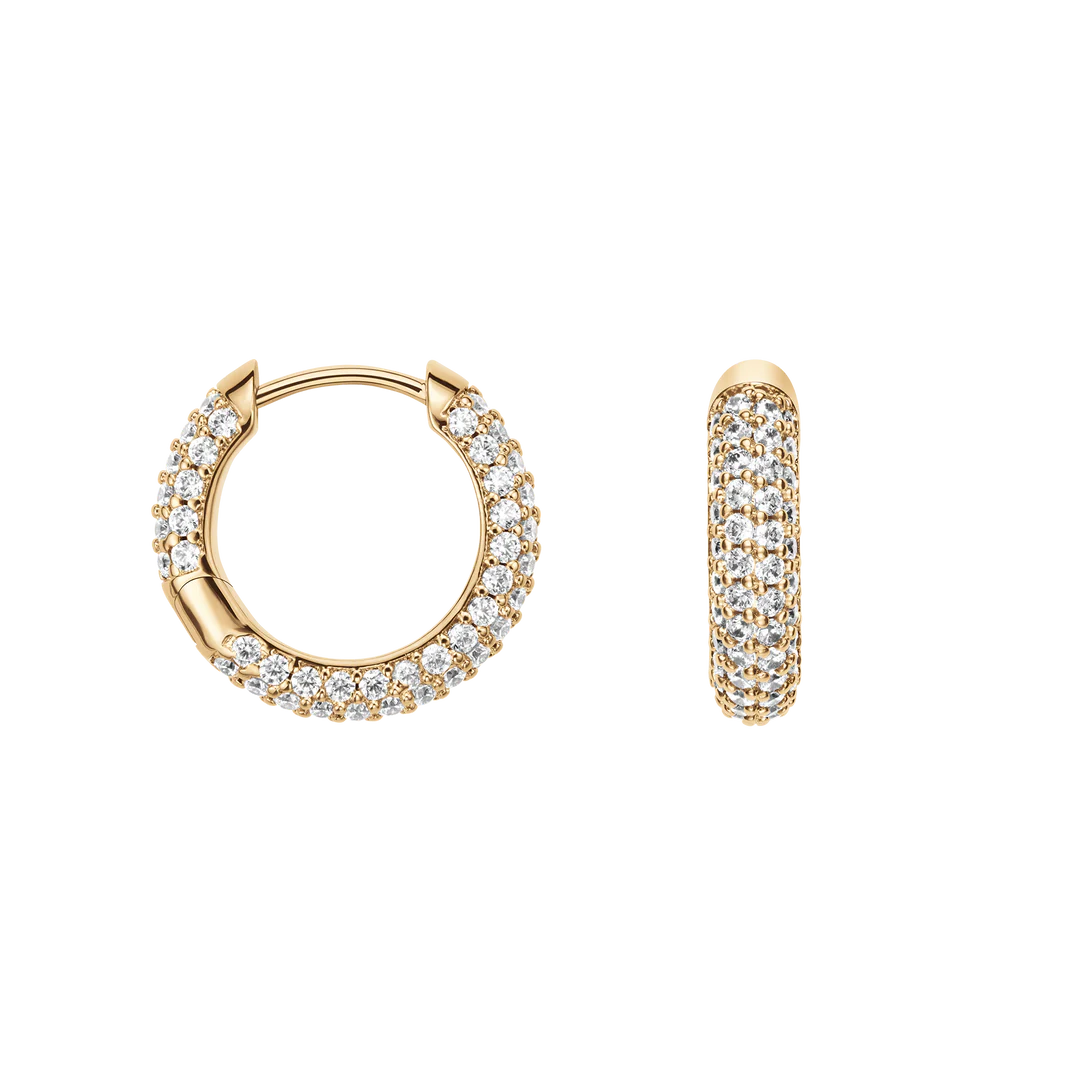 Daniel Wellington Pavé Gold Earrings DW00400642. The Daniel Wellington DW00400642 earrings are elegant women's hoops made of hypoallergenic steel with a gold finish, embellished with a pavé of white crystals that add brightness and sophistication. Featuring a hook closure, they combine style and comfort, becoming the perfect accessory to complete any look with a touch of sophistication. Original Daniel Wellington packaging. Official Daniel Wellington guarantee.