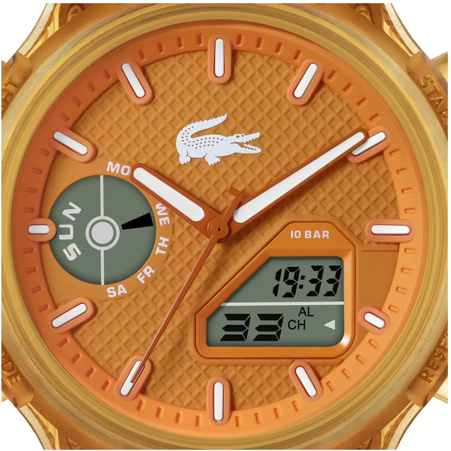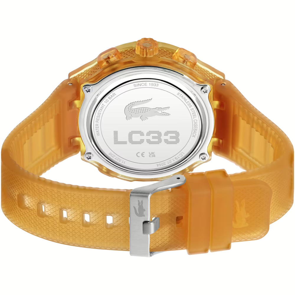 The Lacoste LC33 2011431 watch combines bold design and versatility: the 45 mm transparent orange TR90 case encloses a petit piqué textured dial and analog-digital movement. Water resistant to 10 ATM (100 meters), the orange silicone strap ensures comfort and durability. This watch offers functions such as a stopwatch, alarm, calendar, and dual display, and is perfect for those looking for a sporty accessory full of personality. Original Lacoste packaging. Official Lacoste warranty.
