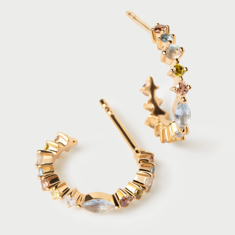 PDPAOLA Small Lotus Hoop Earrings AR01-C77-U. Small open hoop earrings with multicolored zirconia of various sizes and shapes.
