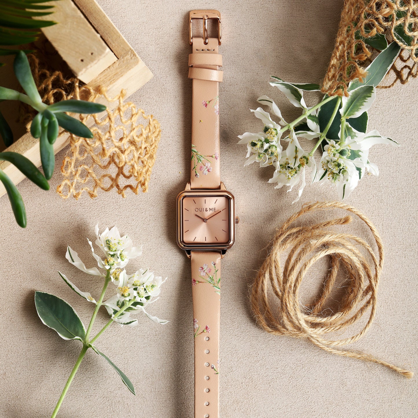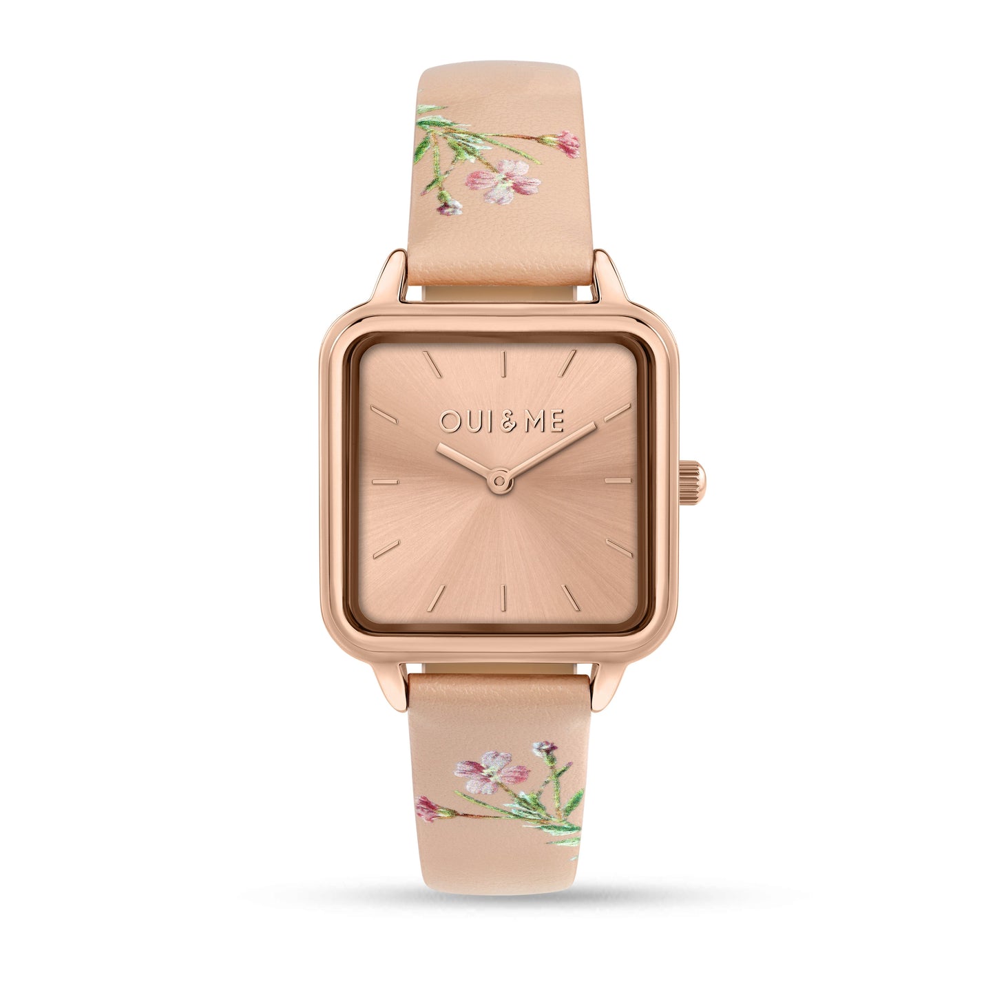 OUI&ME women's watch from the HARMONIE collection. Watch with MVT. M2025 movement, time only function. 2H. Dial: 2 UPMR hands, polished steel finish, ROSE GOLD color. SUNRAY. Strap type: Cut. Strap material: Pink leather strap. Mineral glass case measuring 36.20x27.50. Clasp: PIN buckle. Water resistance: 3 ATM. Weight: 36 gr. Product code: ME010383. Color: ROSE GOLD. Materials: Recycled steel. Recycled leather. Packaging: original OUI&ME box. Warranty: OUI&ME international warranty.