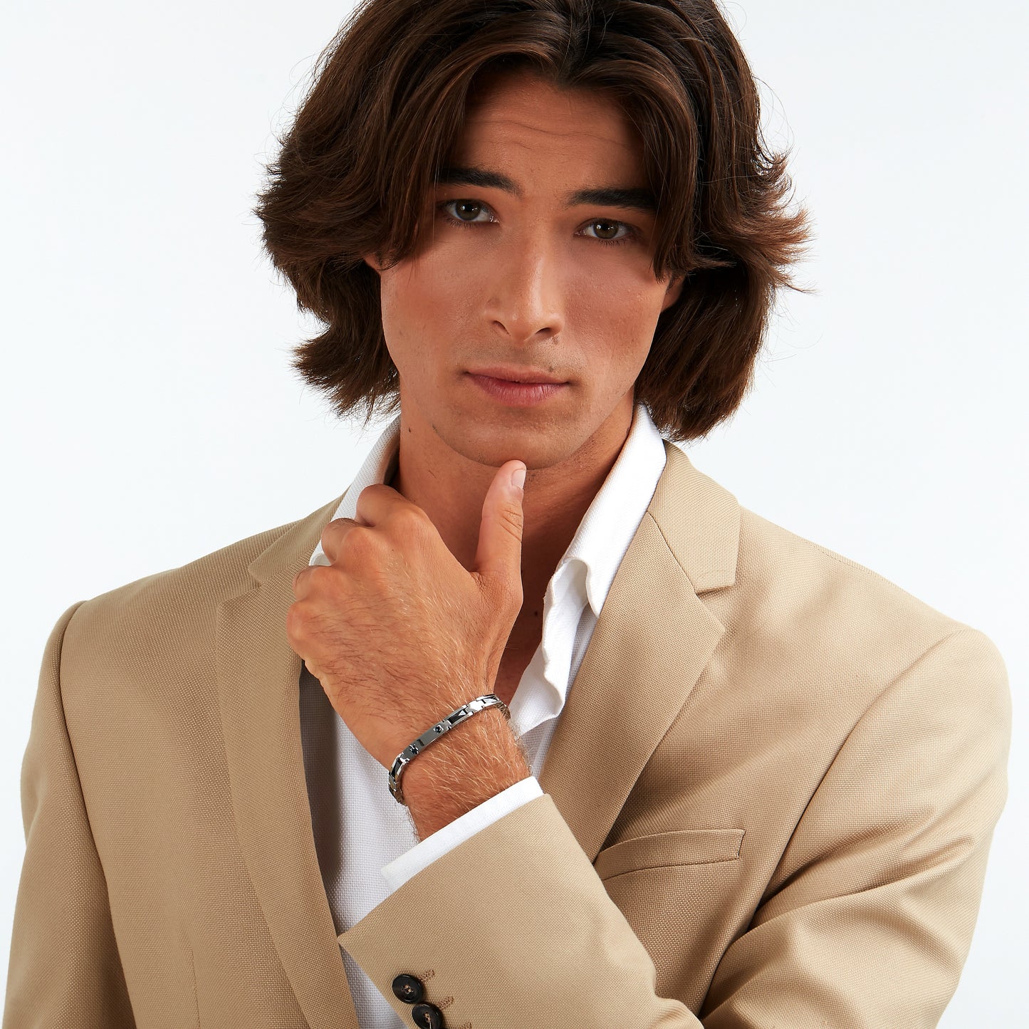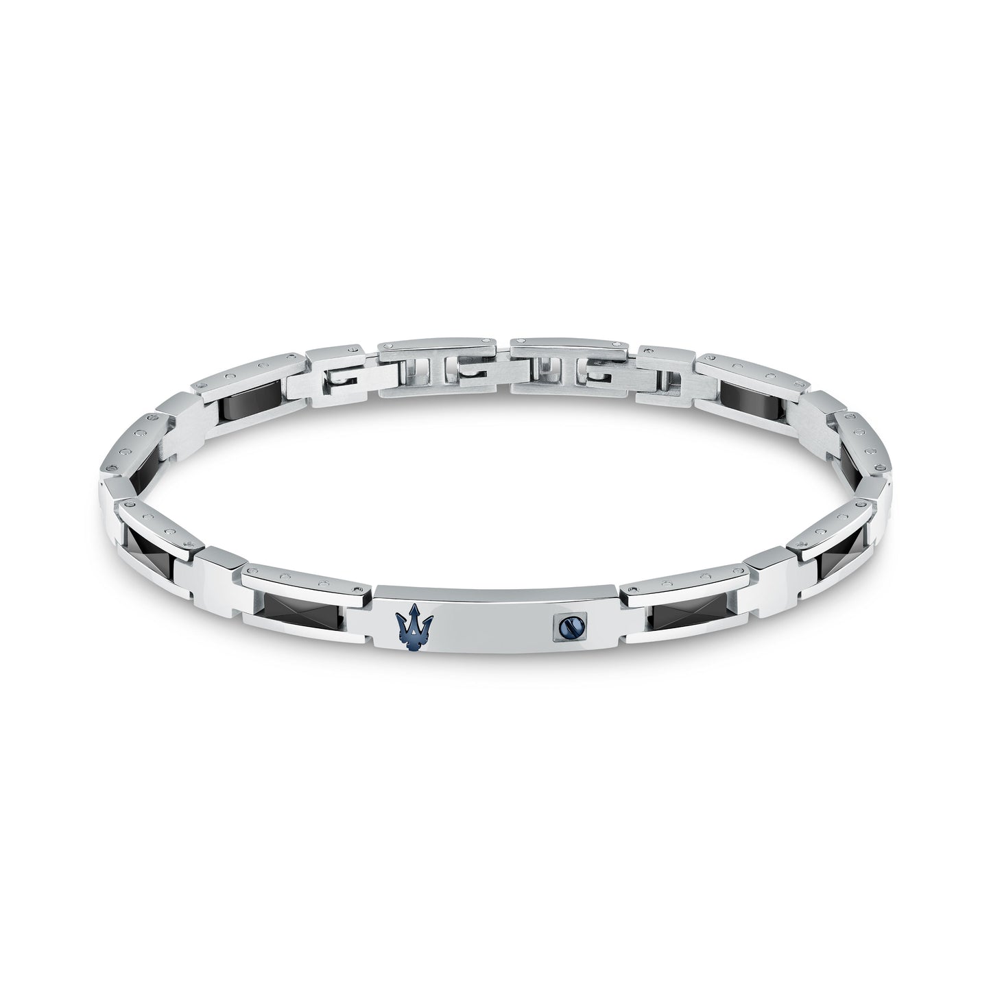 MEN'S MASERATI CERAMIC BRACELET JM423ATZ28. Dimensions: 18.5|3CM. Color: LIGHT BLUE. Materials: steel, ceramic, blue IP. Clasp Type: JEWELRY Buckle. Weight: 25.3g. Product Warranty: MASERATI International Warranty. Packaging: Original MASERATI box.
