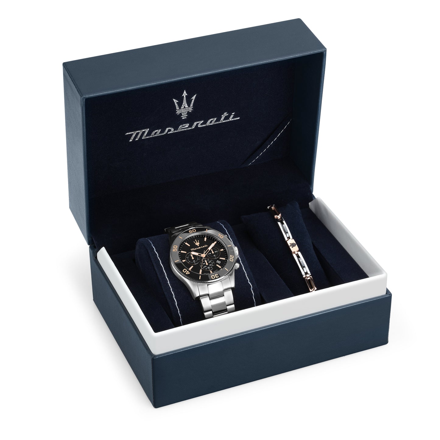 Men’s Watch Maserati Competizione R8873600001. Men’s watch with Miyota JS25 quartz movement and chronograph functions with date. Stainless steel case with a diameter of 43 mm. Black ceramic bezel. Black analog dial with baton indices, logo at 12 o’clock and date between 4 and 5 o’clock. Screw-down case back and crown for enhanced water resistance. Hypoallergenic stainless steel strap; deployant clasp with push buttons. Water resistant up to 100 meters. Included in the special box: Maserati stainless steel bracelet with black logo and rose gold plated details; safety clasp. Packaging: Original MASERATI box. Warranty: International MASERATI warranty.