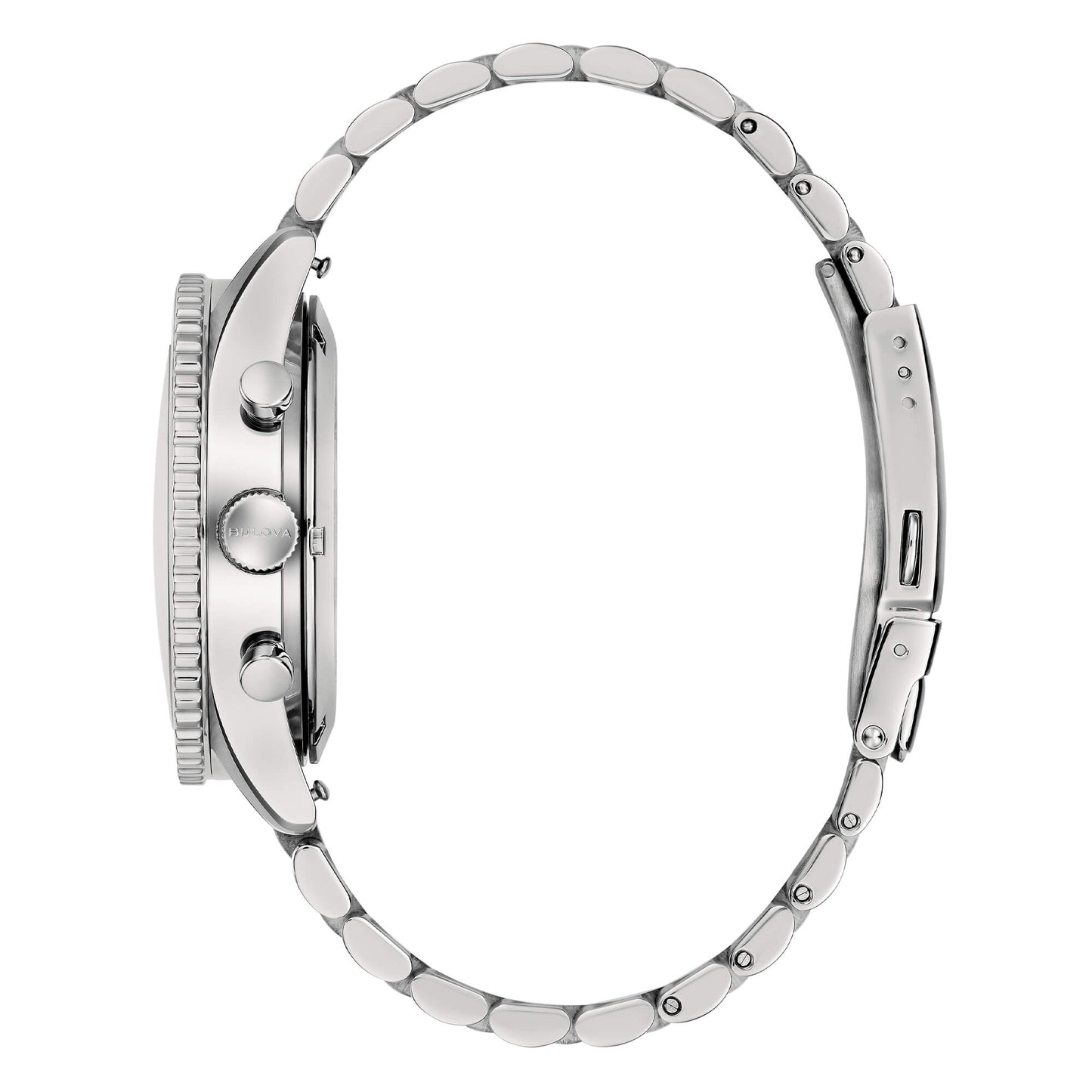 Bulova Marine Star Chrono Anniversary Special Edition 98B451 men's watch. The Bulova Marine Star 98B451 was created for Bulova's 150th anniversary and features a black dial enclosed in a 43mm stainless steel case with a black and red bezel and a stainless steel bracelet. Equipped with a 262 kHz Precisionist automatic movement, it is water resistant to 200 meters. Bezel: unidirectional rotating. Case back: screw. Sapphire crystal. 2-year Bulova warranty.