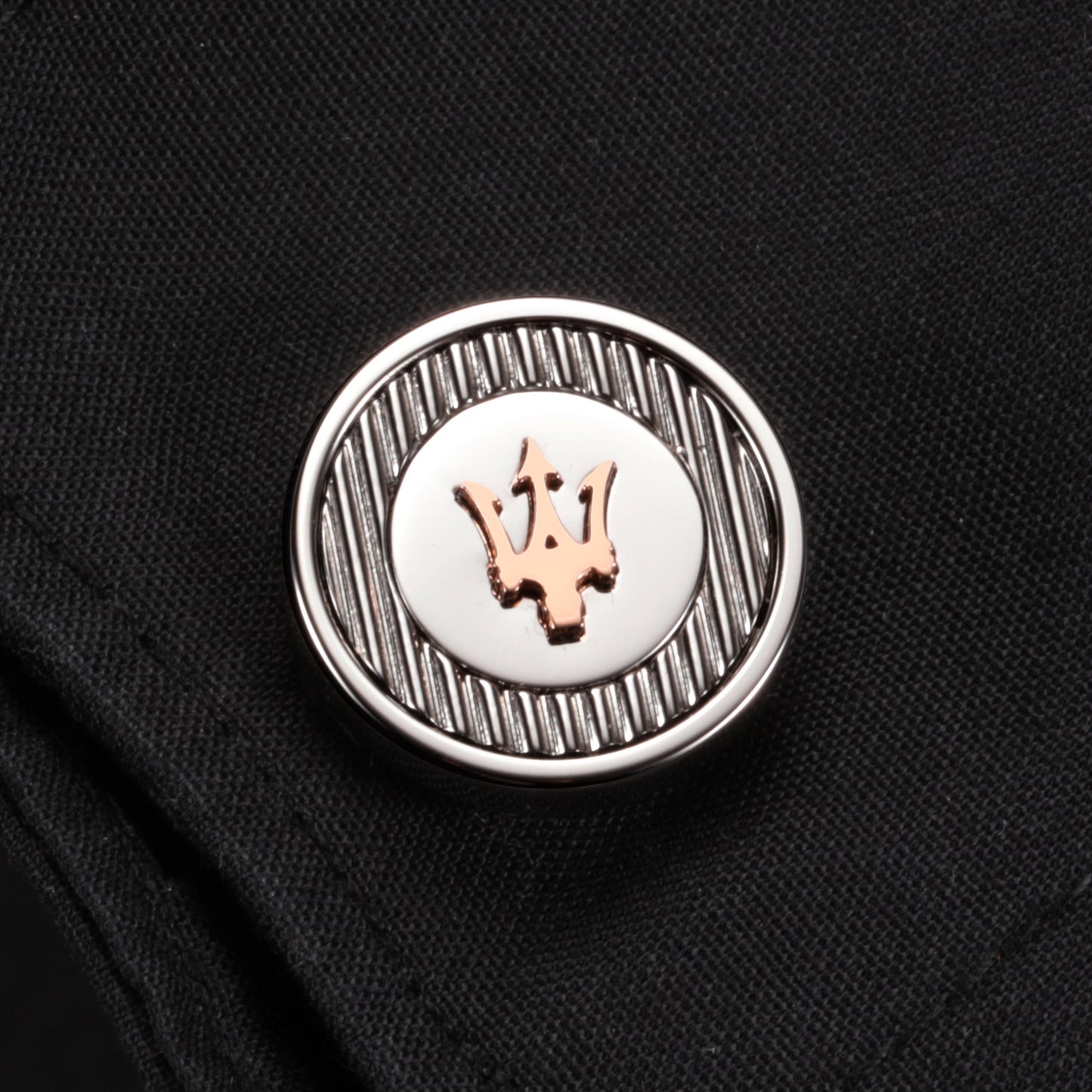 MASERATI ICONIC JM121ATK14 MEN'S CUFFLINKS. Dimensions: 1.5 x 0.3 cm. Materials: Steel. Rose gold PVD. Weight: 13.75 g. Product Warranty: MASERATI International Warranty. Packaging: Original MASERATI box.