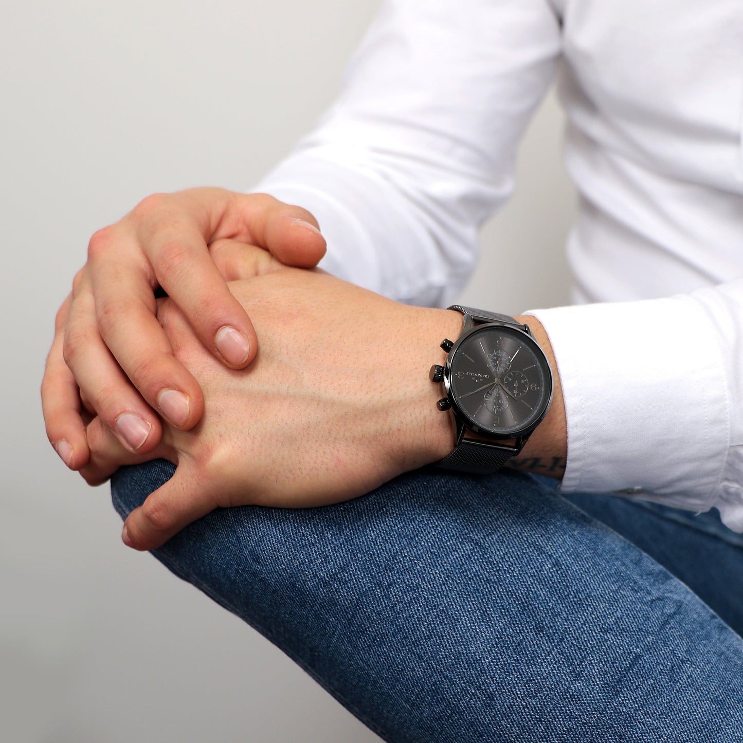 CHRONOSTAR Men's Watch from the DANDY collection. Watch with MVT VD38A1 movement, Multifunction function. Dial: Multifunction UPMR, polished alloy finish, GREY. SUNRAY color. Strap type: Mesh Band. Strap material: Gray metal bracelet. Mineral glass case, size 44. Clasp: Clip and hook. Water resistance: 3 ATM. Weight: 85 gr. Product code: R3753300002. Color: GUNMETAL. Materials: Alloy. Steel. PVD GUN. Packaging: original CHRONOSTAR box. Warranty: CHRONOSTAR international warranty.