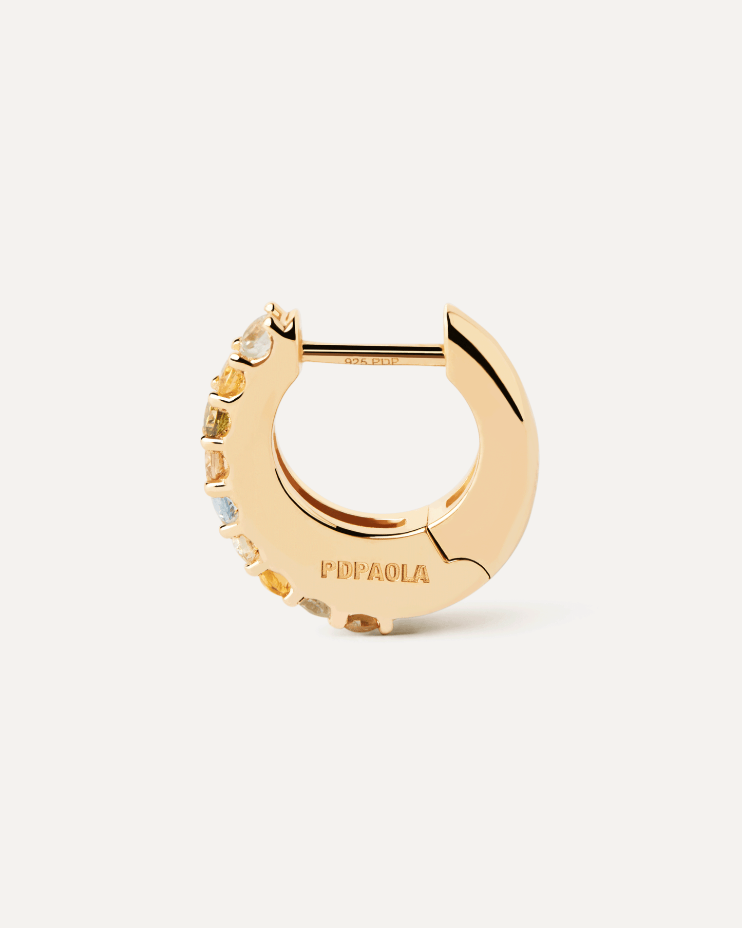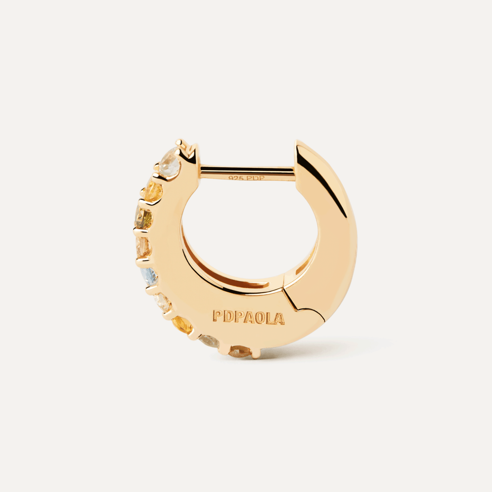 PDPAOLA Vivi AR01-B90-U Hoop Earrings. Gold-plated hoop earrings with multicolored cubic zirconia stones.