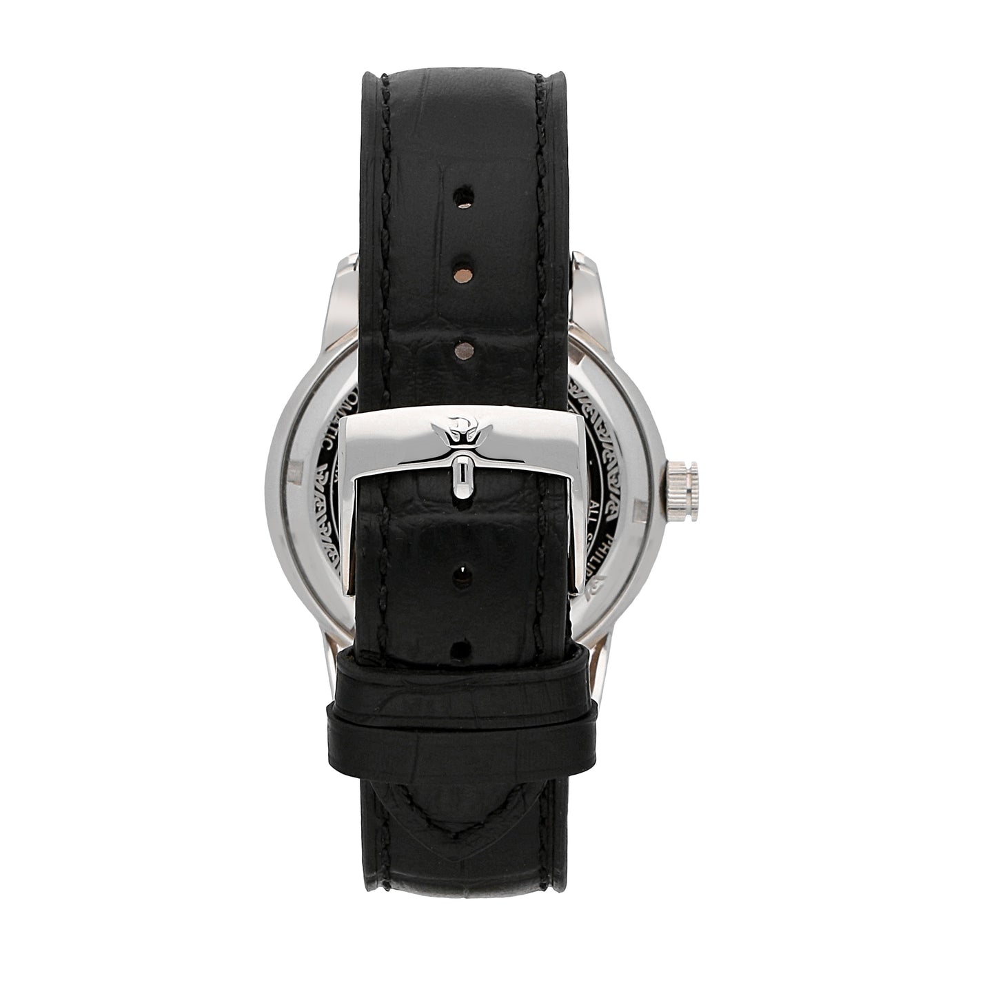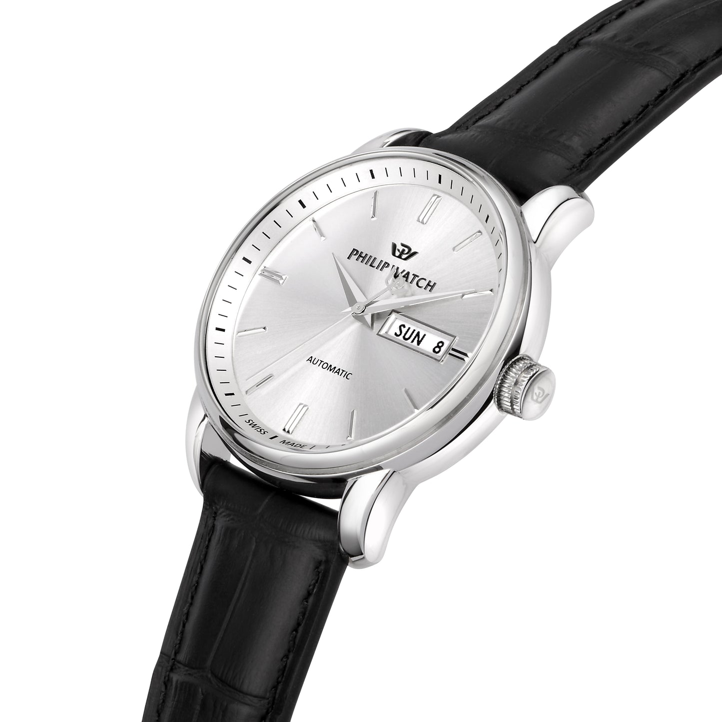 PHILIP WATCH men's watch from the ANNIVERSARY collection. Watch with ETA 2836-2 movement, automatic function. Dial: 3-hand indexes with date display at 3 o'clock, polished finish, SILVER color. Strap type: Cut. Strap material: Black leather strap. Mineral glass case, size 40. Clasp: PIN buckle. Water resistance: 10 ATM. Weight: 85.73 g. Product code: R8221150006. Color: SILVER. Materials: Steel. Natural leather. Packaging: original PHILIP WATCH box. Warranty: PHILIP WATCH international warranty.