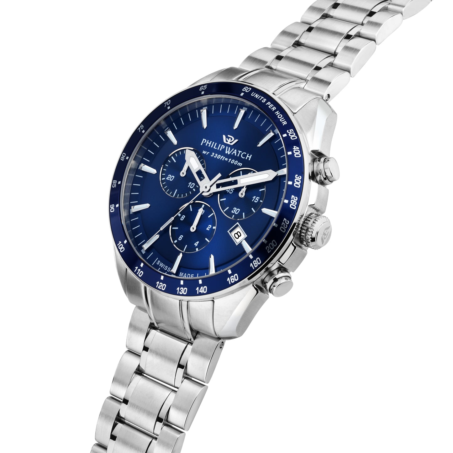 Men’s Watch Philip Watch Blaze R8273995017. Men’s watch by Philip Watch with RONDA 5040D quartz movement and chronograph functions with date. Stainless steel case with a diameter of 42 mm. Bezel with blue IP coating. Screw-down case back and crown for enhanced water resistance. Blue analog dial with baton indices, logo at the top, and date window between 4 and 5 o’clock. Anti-reflective sapphire crystal. Hypoallergenic stainless steel strap; deployant clasp with push buttons. Water resistant up to 100 meters deep. Packaging: original PHILIP WATCH box. Product with international PHILIP WATCH warranty.