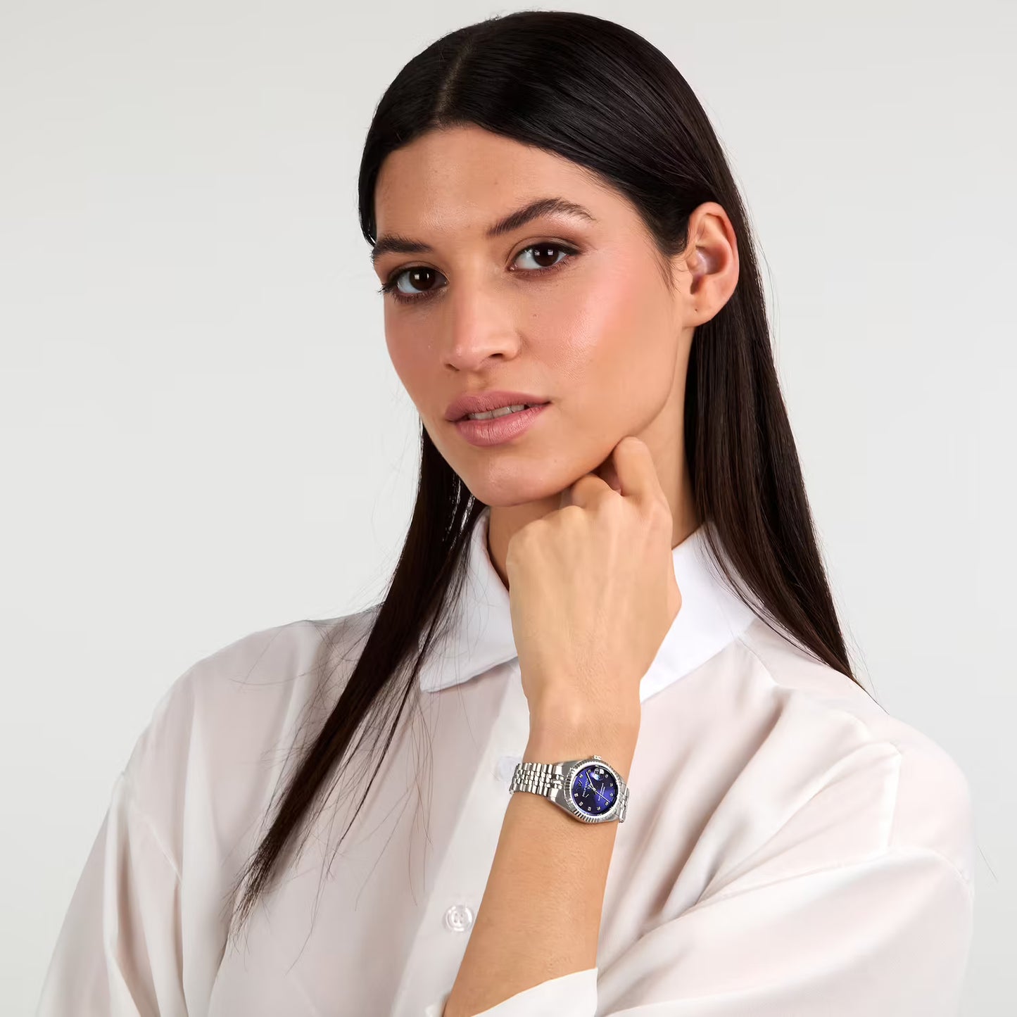 Women’s Watch Philip Watch Caribe Urban R8253597668. Women’s watch with ETA F04.115 quartz movement and time-only functions with date. Stainless steel case with a diameter of 28 mm. Fluted bezel. Screw-down case back and crown for increased water resistance. Purple analog dial with diamond hour markers, logo at 12 o’clock, and date window at 3 o’clock with magnifying lens. Sapphire crystal. Jubilee bracelet in hypoallergenic stainless steel with deployant clasp and push-buttons. Water-resistant up to 100 meters. Packaging: Original PHILIP WATCH box. Warranty: International PHILIP WATCH warranty.