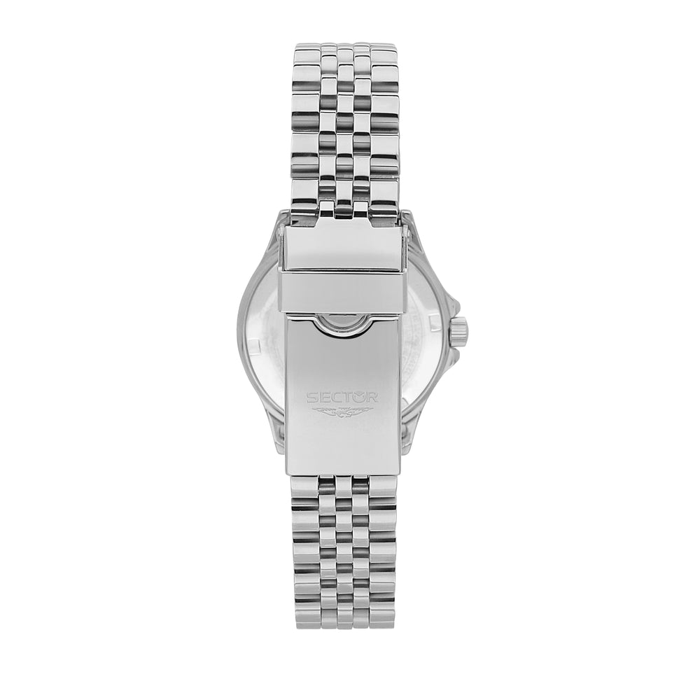 SECTOR women's watch from the 230 collection. Watch with MVT. M2035 movement, time only function. 3H. Dial: 3 hands UPMR, polished steel finish, WHITE color. Strap type: True remborded. Strap material: Steel-colored metal bracelet. Mineral glass case, size 32. Clasp: Diver's buckle with safety lock. Water resistance: 10 ATM. Weight: 91.5 g. Product code: R3253161538. Color: SILVER. Materials: Steel. Packaging: original SECTOR box. Warranty: SECTOR international warranty.