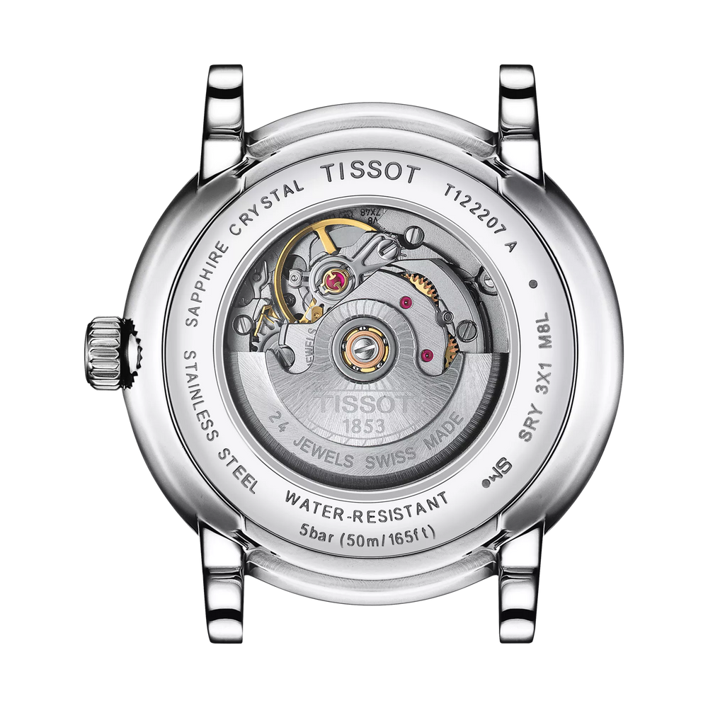 Tissot Carson Premium Automatic Women's Watch. Item number: T122.207.11.036.00. The Tissot Carson, a timeless watch for any time and place, will be the perfect partner to accompany you on every important occasion in your life, ensuring that every moment is perfect at the right time. Its classic style allows it to never go out of style, while giving it a sumptuous look, highlighted by an elegant dial design and thin, elongated hands that move on the dial in time. Tissot watch with Swiss automatic ETA 2671 movement with up to 38 hours of power reserve, 30mm 316L stainless steel case with transparent caseback, domed scratch-resistant sapphire crystal with anti-reflective coating, silver-colored dial with indexes and 8 diamonds of 0.04 carats, VS-SI clarity, 8/8 cut. Gray stainless steel strap, butterfly clasp with push buttons. Waterproof up to 5 bar. 2-year warranty.