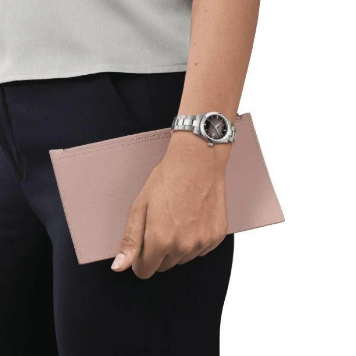 Tissot T-My Lady Automatic women's watch. Product code: T132.007.11.066.00. The Tissot T-My Lady can be considered the feminine counterpart to the Tissot Gentleman, embodying all the haute horlogerie characteristics that Tissot bestows on its timepieces. The slender, understated curves of this timepiece sit perfectly on any wrist, making it the ideal everyday companion. Its self-winding mechanical movement is regulated by a Nivachron balance spring and boasts exceptional anti-magnetic properties. Easy to wear, each watch in this collection comes with two interchangeable straps, making it the perfect accessory for any outfit. Tissot watch with Swiss automatic movement with a power reserve of up to 48 hours, patented Nivachron balance spring, transparent case back, 29.30 mm 316L stainless steel case, domed scratch-resistant sapphire crystal, graduated anthracite-black dial with indexes and 8 diamonds, 0.02 carats, clarity VS-SI, cut 8/8 Single Cut. Gray stainless steel strap, butterfly clasp with push buttons, interchangeable bracelet with quick release. Water resistant to 10 bar. 2-year warranty.