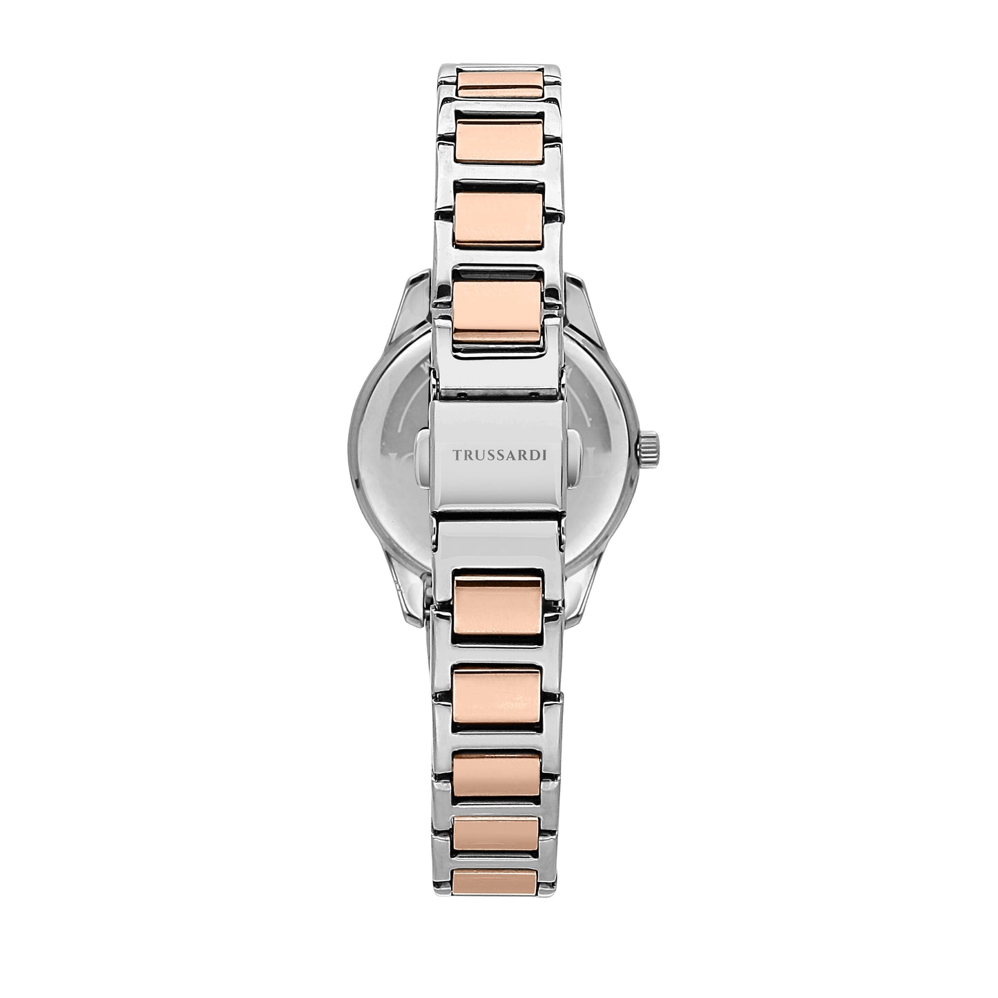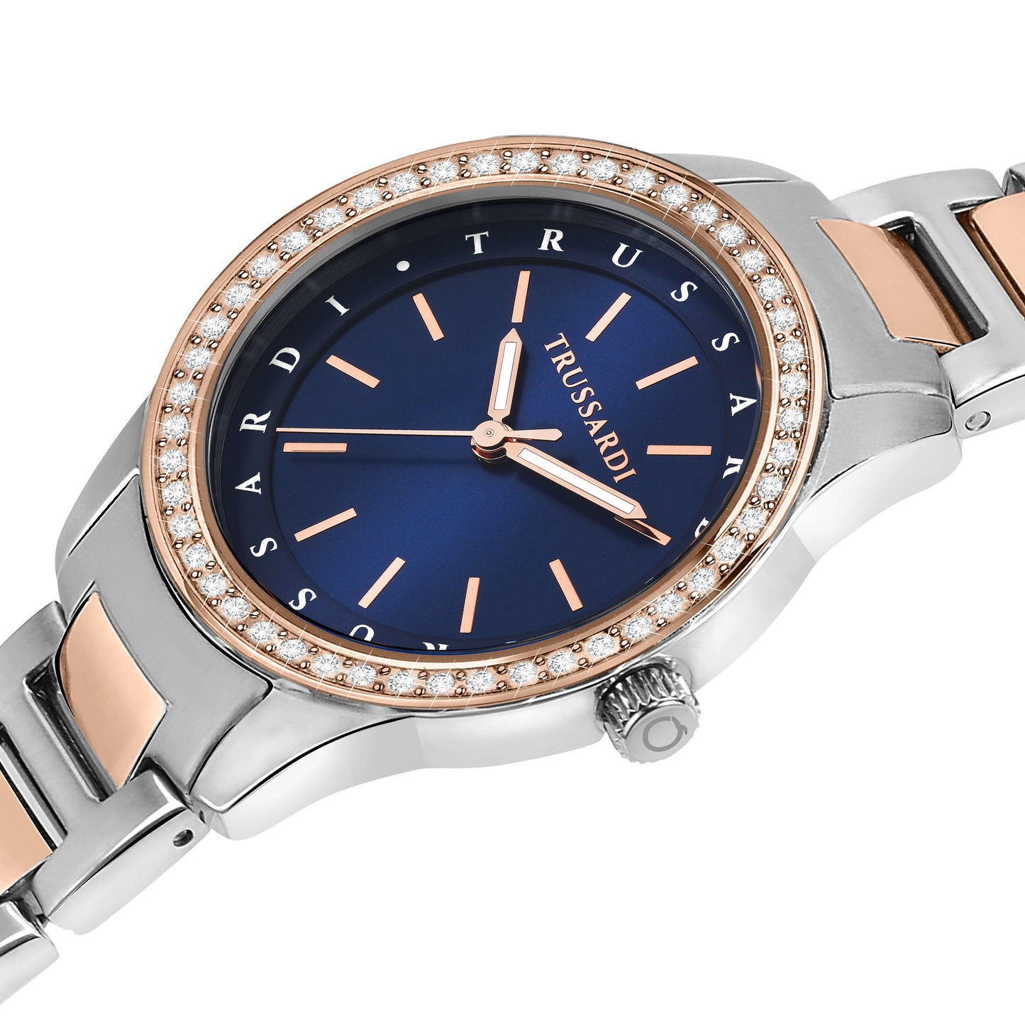 TRUSSARDI Women's Watch from the T-SKY collection. Watch with MVT VJ21 movement, Time only function. 3H. Dial: 3-hand UPMR, Steel finish. Polished, BLUE color. Strap type: Solid. Strap material: Rose Gold colored metal bracelet. Steel. Mineral glass case, size 30. Clasp: DEPLOYANTE buckle with buttons. Water resistance: 5 ATM. Weight: 68.5 g. Product code: R2453151507. Materials: Steel. Rose Gold PVD. Crystals. Packaging: original TRUSSARDI box. Warranty: TRUSSARDI international warranty.
