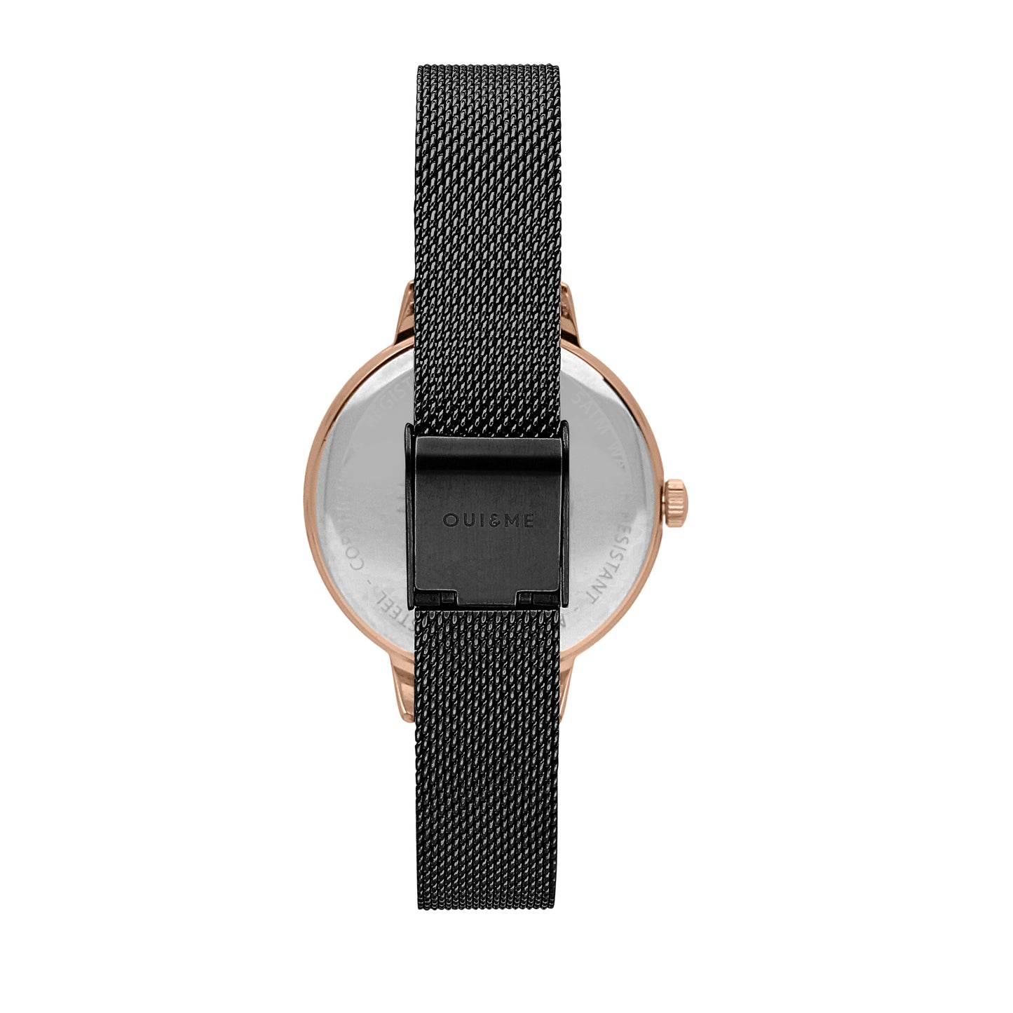 Oui & Me women's watch, code ME010070, AMOURETTE Collection, quartz, Japanese movement, time only, stainless steel, rose gold PVD. The watch features an interchangeable Milanese mesh strap in stainless steel with a snap closure. The round case, 34 mm in diameter, frames a refined black dial and is fitted with mineral crystal. The watch is water resistant to 5 ATM. Packaging: Original Oui&Me box. Warranty: Oui&Me International Warranty.
