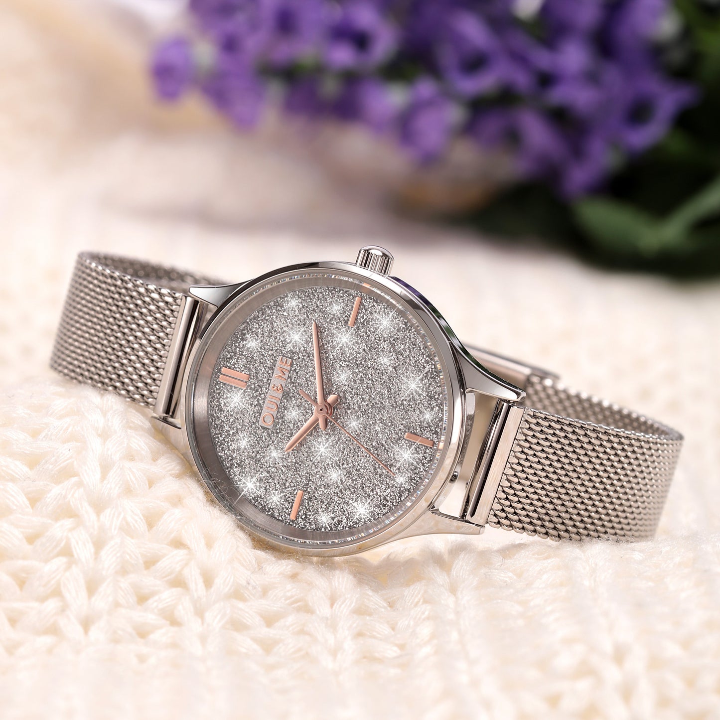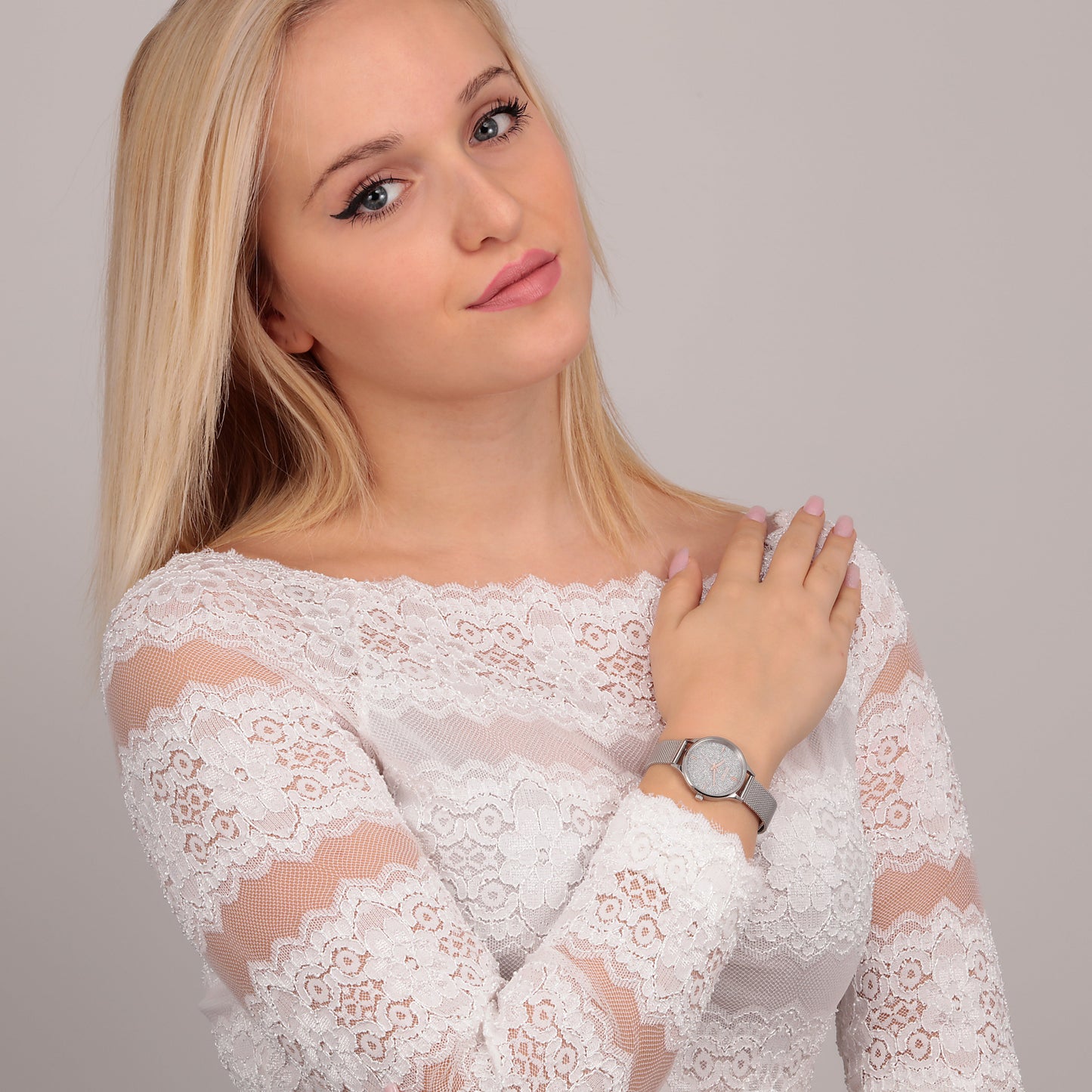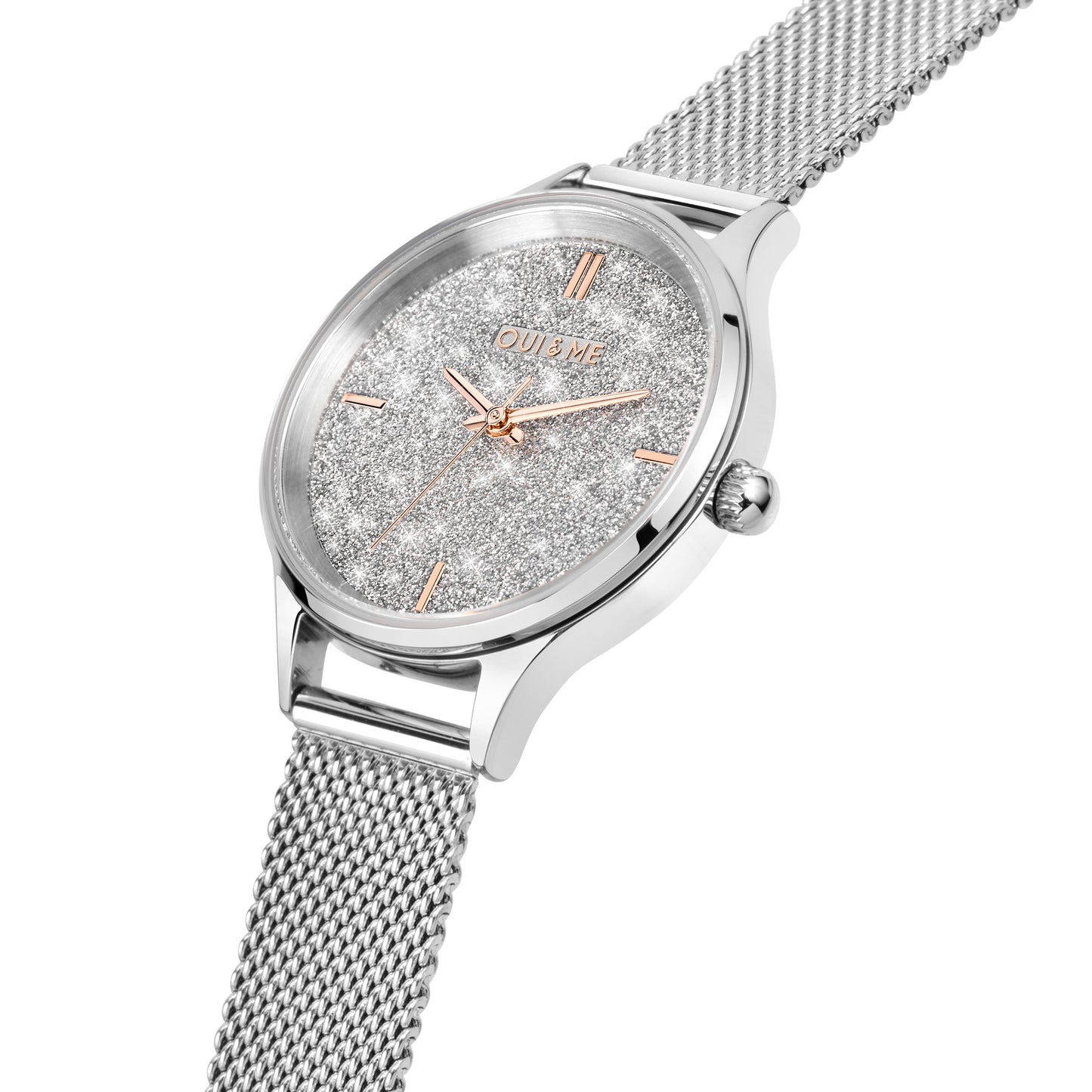 OUI&ME women's watch from the BICHETTE collection. Watch with MVT VJ21 movement, time only function. 3H. Dial: 3 hands UPMR with diamond dust, polished steel finish, WHITE color. Strap type: Mesh Band. Strap material: Steel-colored metal bracelet. Mineral glass case, size 28. Clasp: Clip and hook. Water resistance: 5 ATM. Weight: 44.7 g. Product code: ME010270. Materials: Steel. Packaging: original OUI&ME box. Warranty: OUI&ME international warranty.