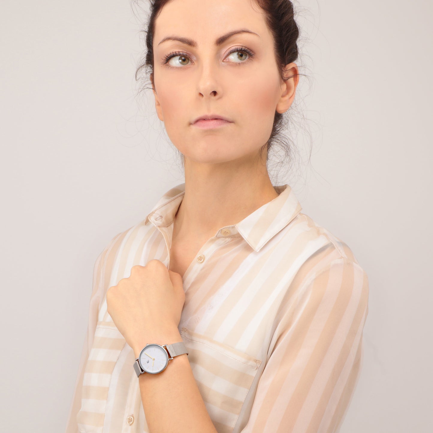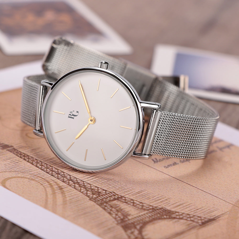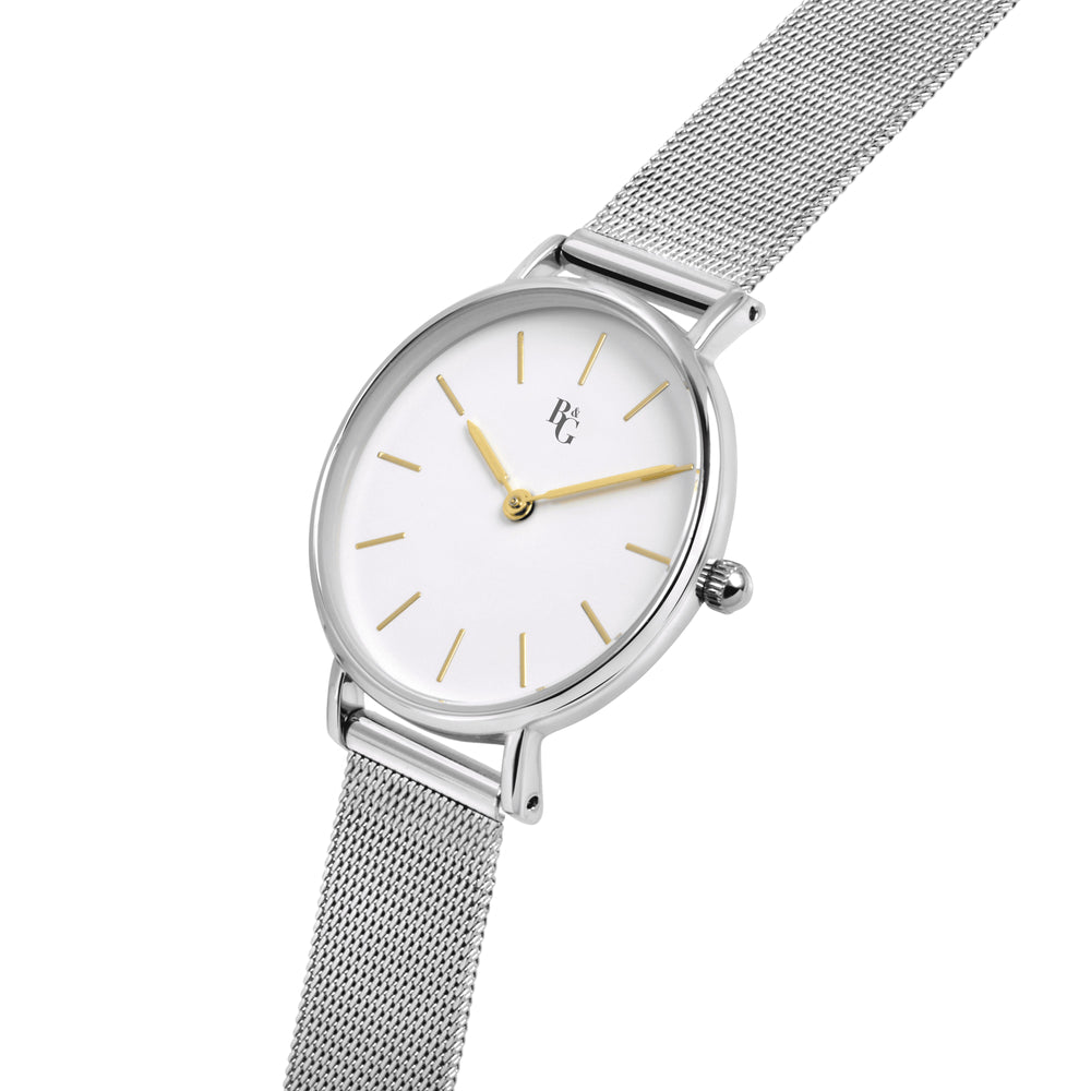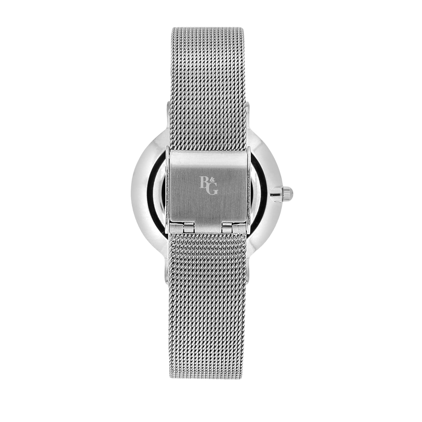 B&G Women's Watch from the PREPPY collection. Watch with MVT TMI VJ20 2H TYPE M movement, Time only function. 2H. Dial: 2 UPMR index hands, polished alloy finish, WHITE color. Strap type: Mesh Band. Strap material: Steel-colored metal bracelet. Mineral glass case, size . Clasp: Clip and hook. Water resistance: Not water resistant. Weight: 46.46 gr. Product code: R3853252525. Materials: Alloy. Steel. Packaging: original B&G box. Warranty: B&G international warranty.