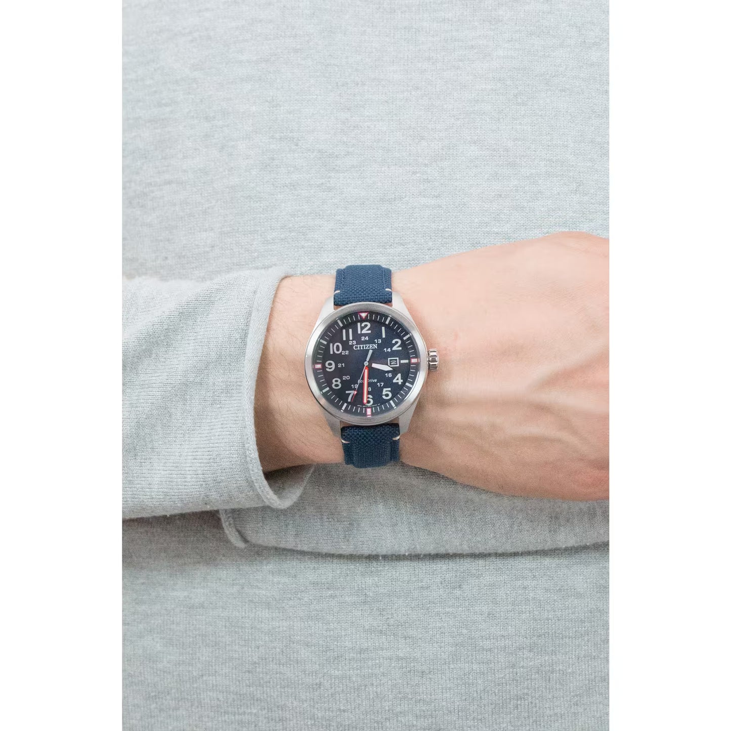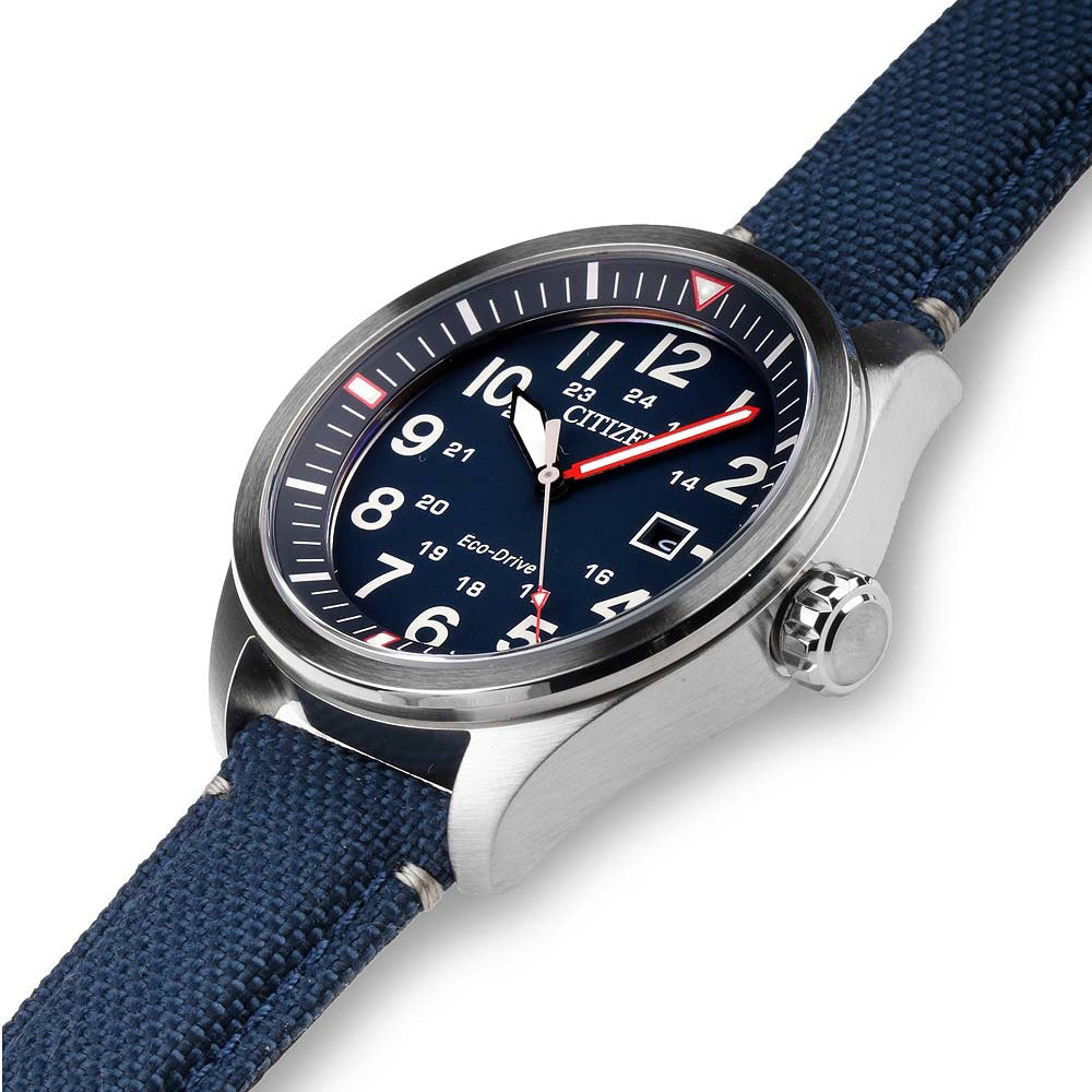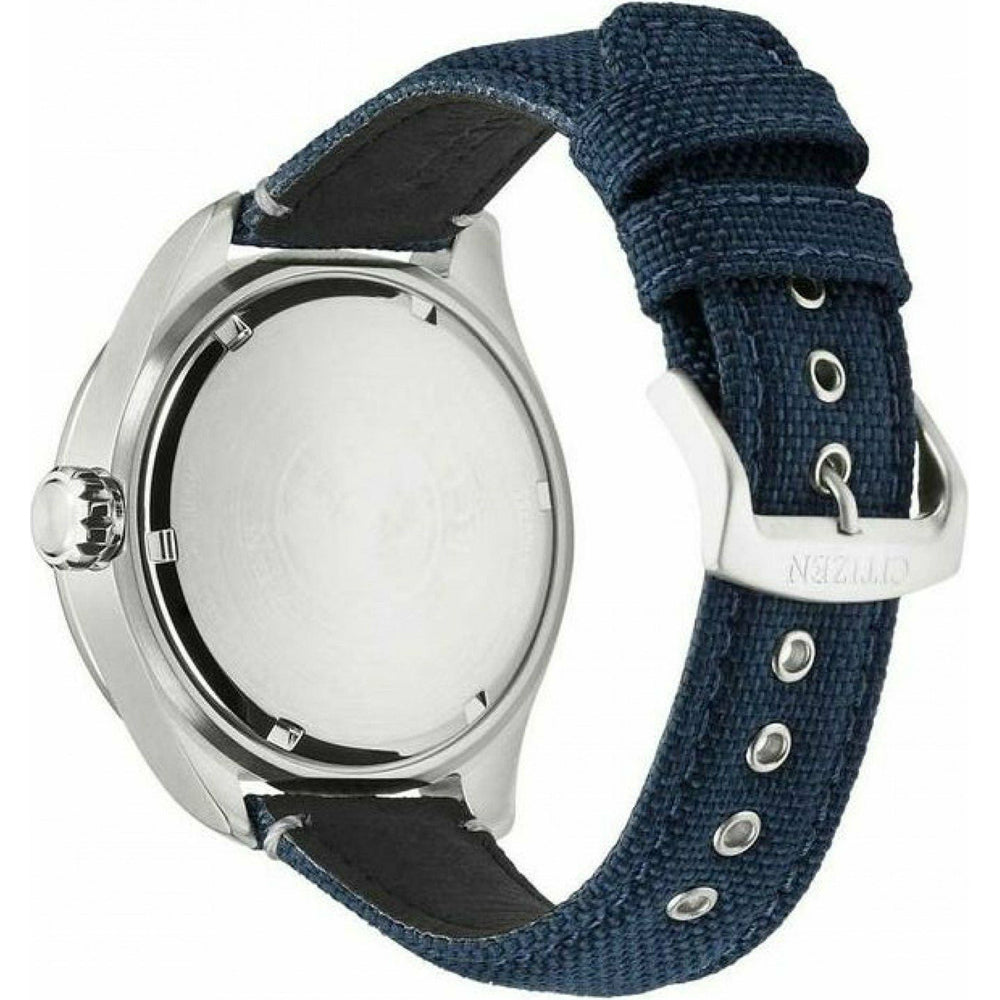 Citizen Urban Men's Watch AW5000-16L. Citizen watch with stainless steel case and screw-down case back, 42.6 mm diameter, blue dial with Arabic numerals. Blue technical fabric strap. Water resistant up to 10 ATM. Eco-Drive movement with 8-month power reserve. Original Citizen packaging, 2-year Citizen warranty.