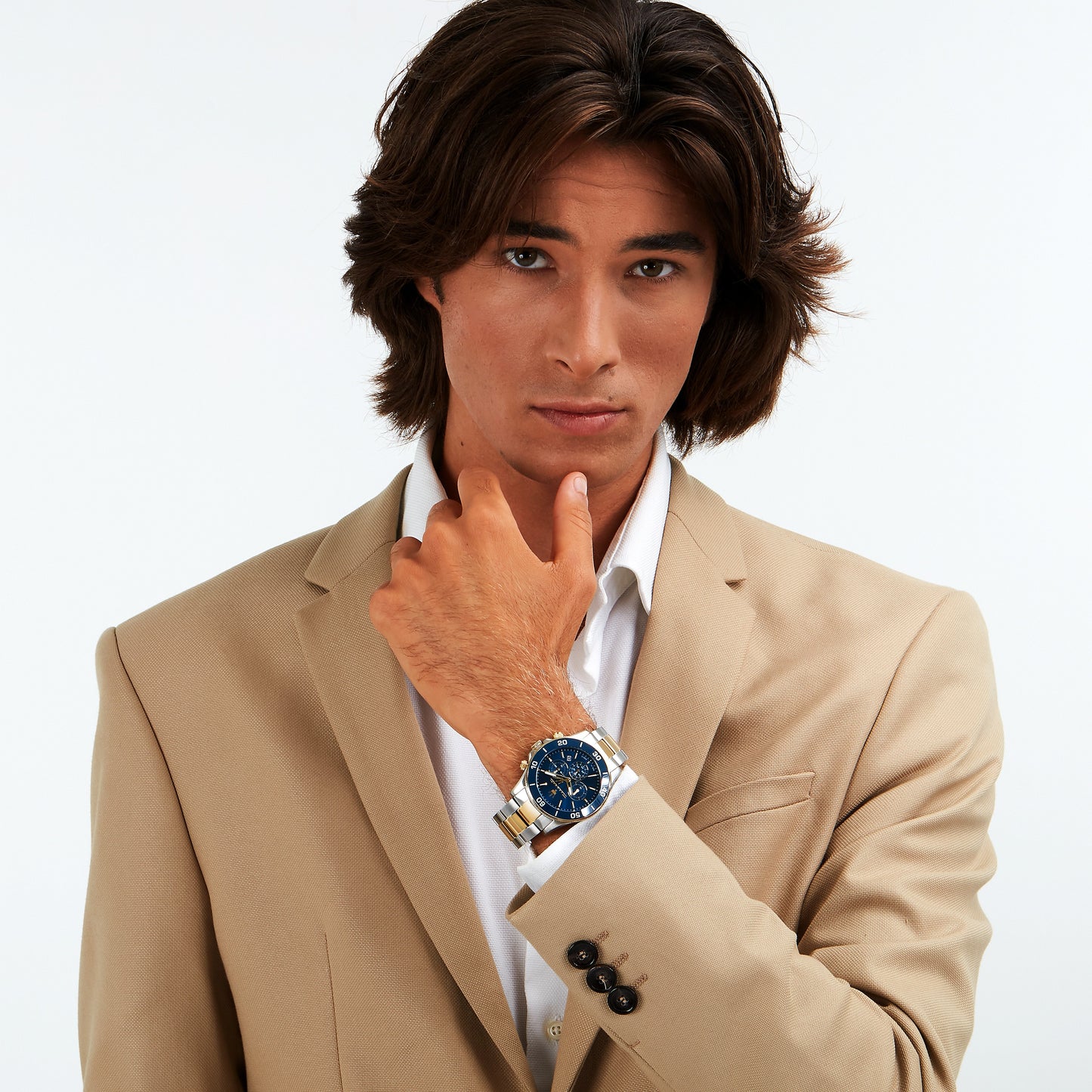 Men's Watch Maserati Competizione R8873600006. Men's watch with Miyota JS25 quartz movement and chronograph functions with date. Stainless steel case with a diameter of 43 mm. Gold-tone bezel with blue ceramic. Blue analog dial with baton indexes, logo at 12 o'clock, and date window at 3 o'clock with magnifying lens. Screw-down case back and crown for enhanced water resistance. Two-tone silver and gold hypoallergenic stainless steel bracelet; deployant clasp with push buttons. Water resistant up to 100 meters deep. Packaging: original Maserati box. Warranty: international Maserati warranty.