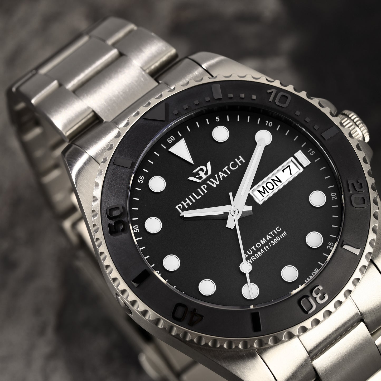 MEN'S WATCH PHILIP WATCH CARIBE R8223597036. Automatic watch with MVT.SW220 movement. Color: SILVER. Materials: Titanium. Sapphire crystal dial, anti-reflective treatment, BLACK, SANDBLASTED with 3 applied index hands with date display at 3 o'clock, satin finish. Case size: 42. Solid Titanium strap, Silver color. Clasp: Diver buckle with push buttons, safety lock and extension. Packaging: original PHILIP WATCH box. Product with PHILIP WATCH international warranty.