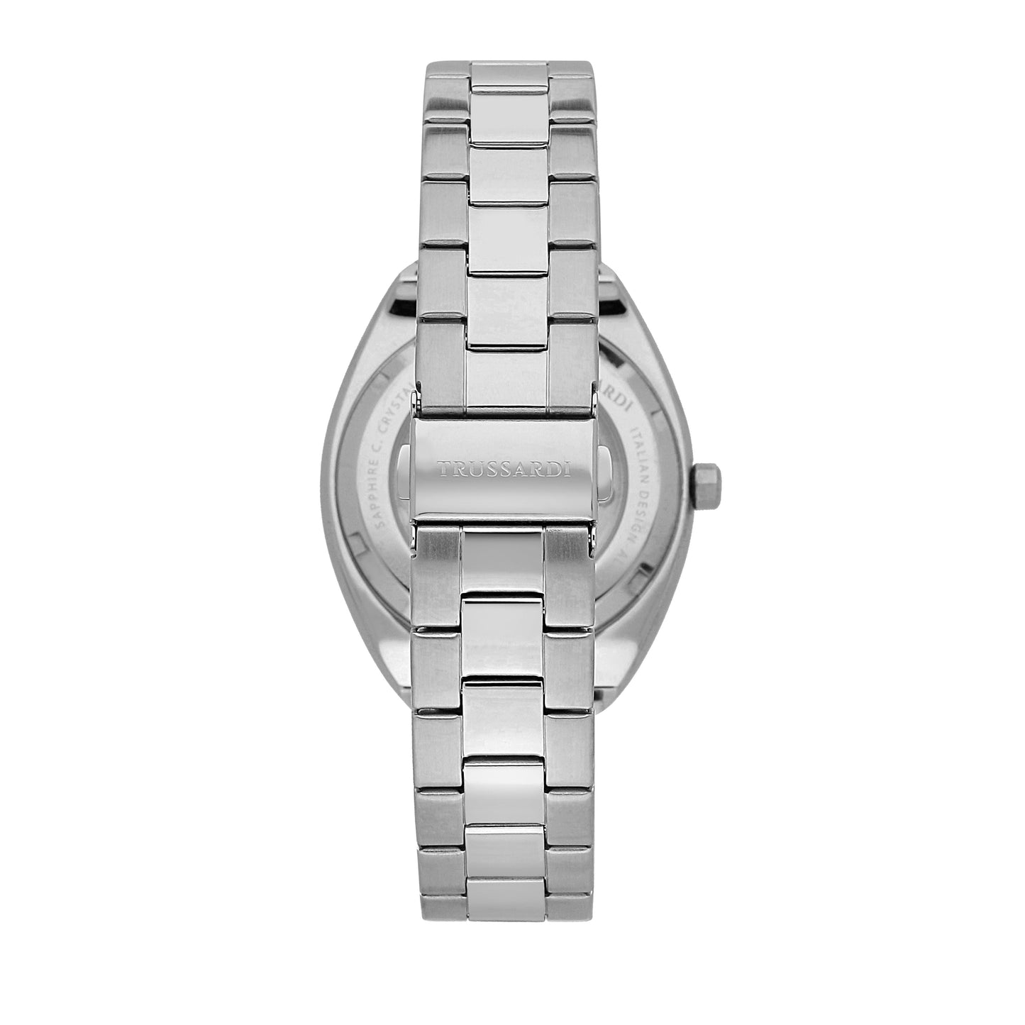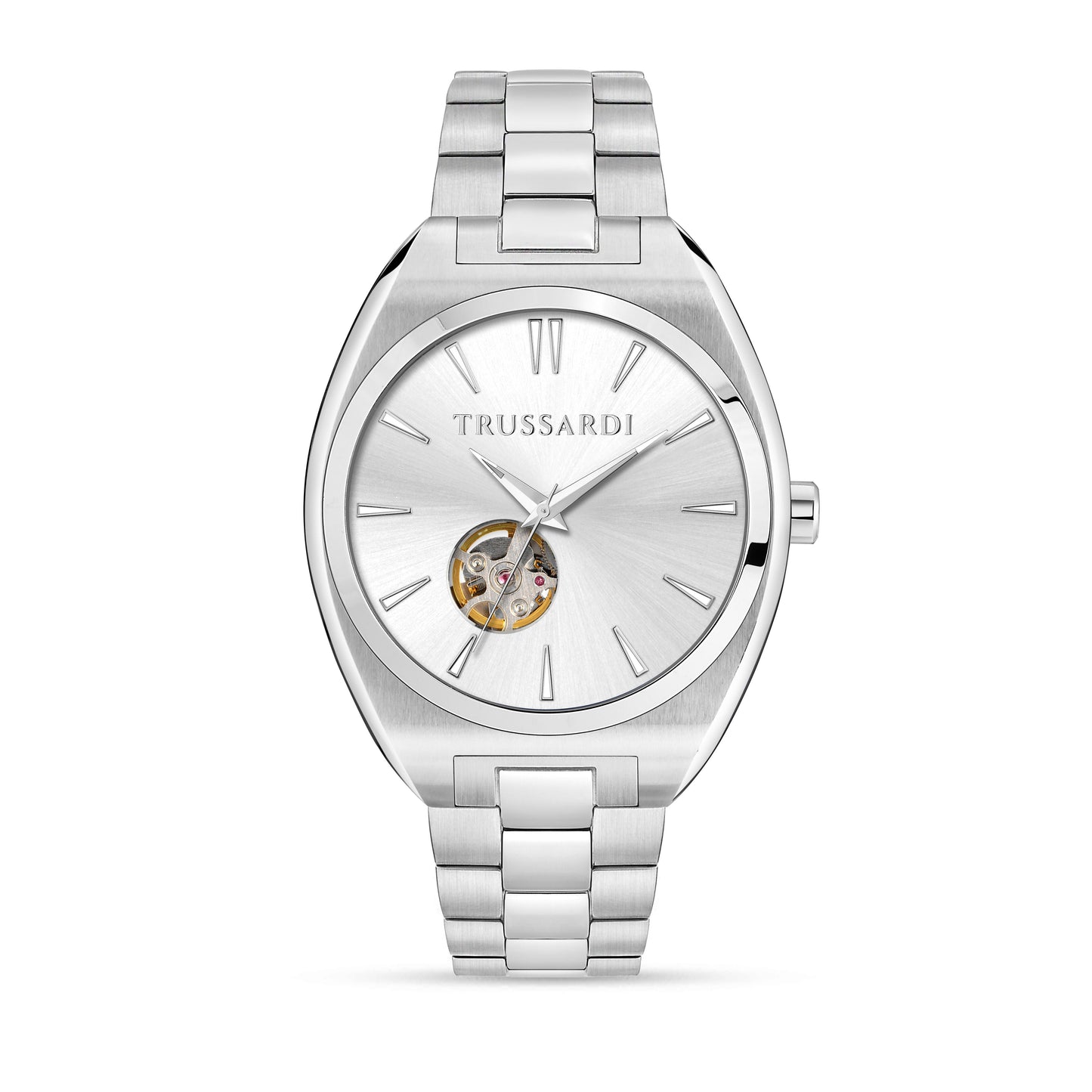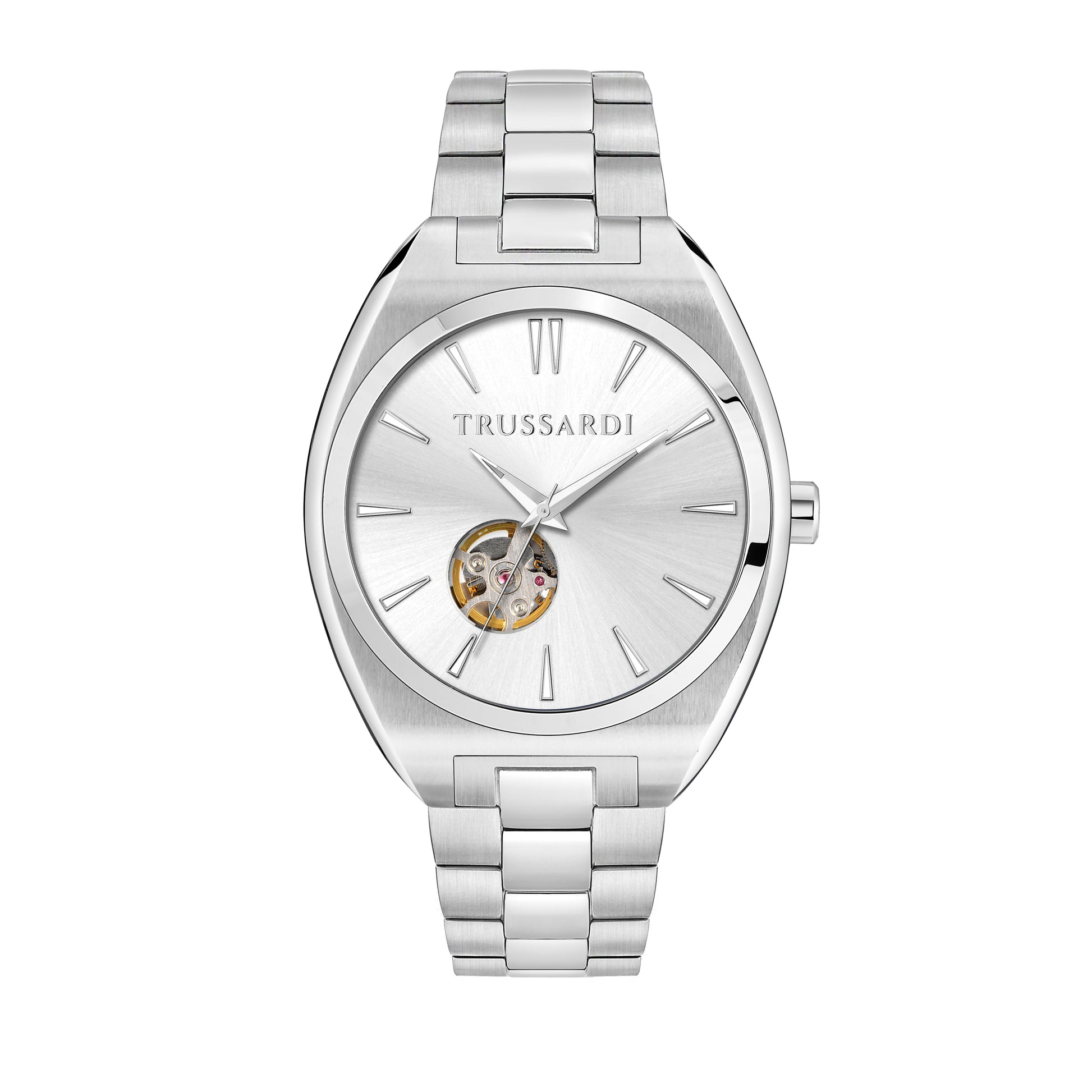 TRUSSARDI Men's Watch from the METROPOLITAN collection. Watch with MVT. M82S0 movement, Automatic function. Dial: Automatic 3-hand UPMR, Polished and satin finish, WHITE color. Strap type: Cap-Folded. Strap material: Steel-colored metal bracelet. Mineral glass case, sapphire treatment, size 42. Clasp: DEPLOYANTE buckle with buttons. Water resistance: 5 ATM. Weight: 153 gr. Product code: R2423159001. Color: SILVER. Materials: Steel. Packaging: original TRUSSARDI box. Warranty: TRUSSARDI international warranty.