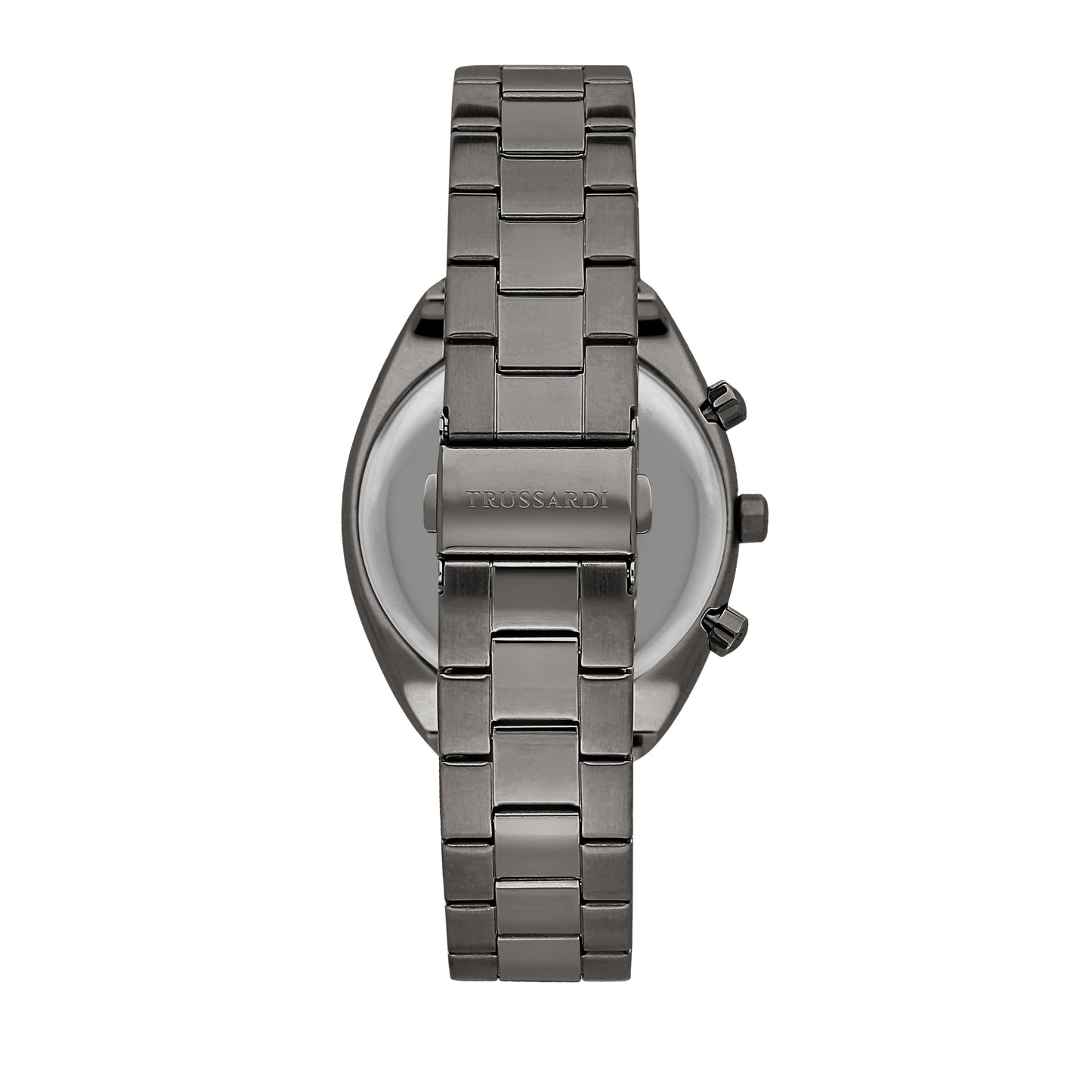 TRUSSARDI Men's Watch from the METROPOLITAN collection. Watch with MVT. VD33 movement, Multifunction function. Dial: Multifunction 3 subdials + calendar at 6 o'clock, Polished and satin finish, GREEN. SUNRAY color. Strap type: Cap-Folded. Strap material: Gray metal bracelet. Mineral glass case, size 44. Clasp: Folding clasp with buttons. Water resistance: 5 ATM. Weight: 153 g. Product code: R2453159001. Color: GUNMETAL. Materials: Steel. IP gun. Packaging: original TRUSSARDI box. Warranty: TRUSSARDI international warranty.