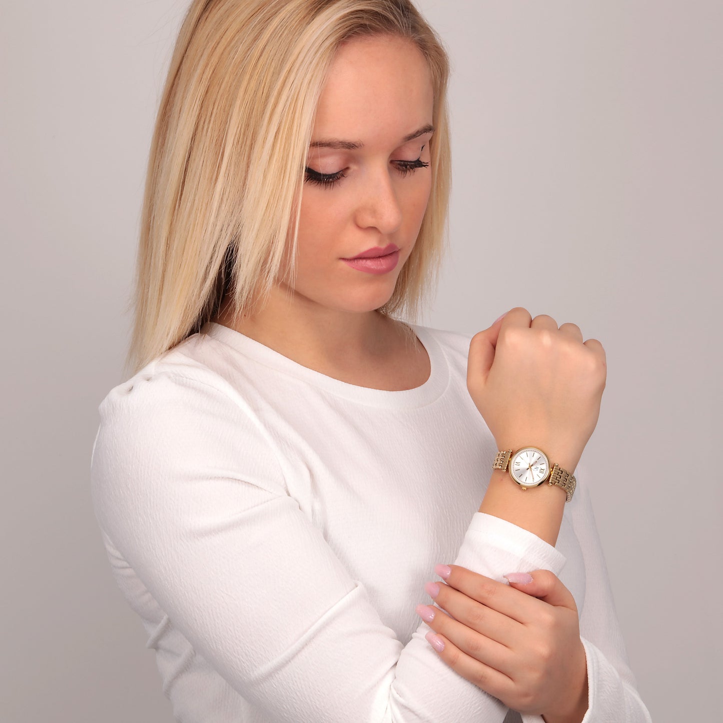 Orologio Donna B&G della collezione BELLE. Orologio con movimento MVT. M2035, funzione Solo tempo. 3H. Quadrante: 3 lancette stampato, finitura Lega. Lucido, colore ARGENTO. Tipo cinturino: Solid. Materiale cinturino: Lega di colore Oro. Cassa in Vetro minerale di dimensioni 28. Chiusura: Fibbia DEPLOYANTE con pulsanti. Resistenza all'acqua: 3 ATM. Peso: 48 gr. Codice prodotto: R3853302501. Colore: ORO GIALLO. Materiali: Lega. PVD Oro. Confezione: scatola originale B&G. Garanzia: garanzia internazionale B&G