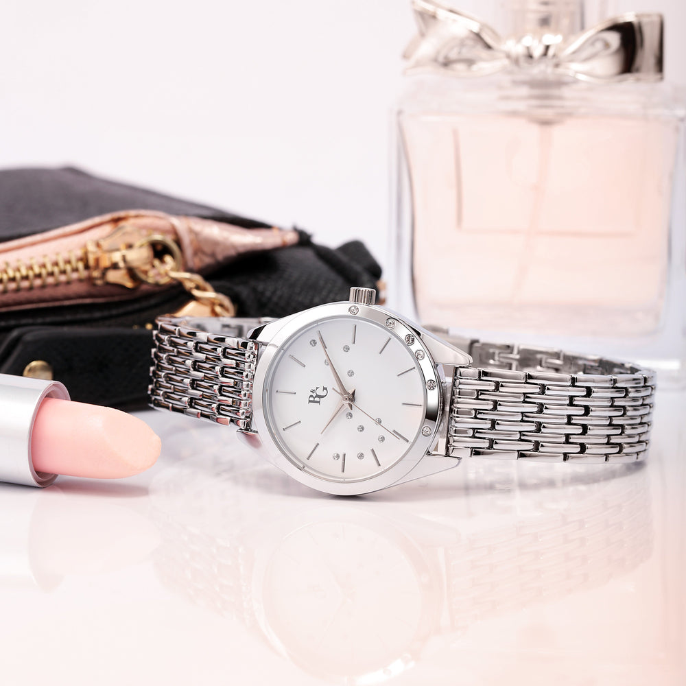 Orologio Donna B&G della collezione MAGIC. Orologio con movimento MVT. M2035, funzione Solo tempo. 3H. Quadrante: 3 lancette UPMR c/diamond dust, finitura Lega. Lucido, colore BIANCO. OPACO. Tipo cinturino: Solid. Materiale cinturino: Lega di colore Acciaio. Cassa in Vetro minerale di dimensioni 30. Chiusura: Fibbia DEPLOYANTE con pulsanti. Resistenza all'acqua: 3 ATM. Peso: 75 gr. Codice prodotto: R3853308503. Colore: ARGENTO. Materiali: Lega. Confezione: scatola originale B&G. Garanzia: garanzia internazionale B&G