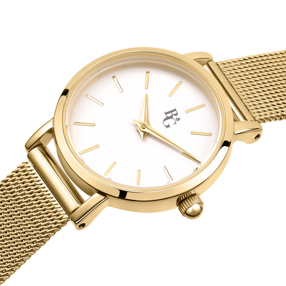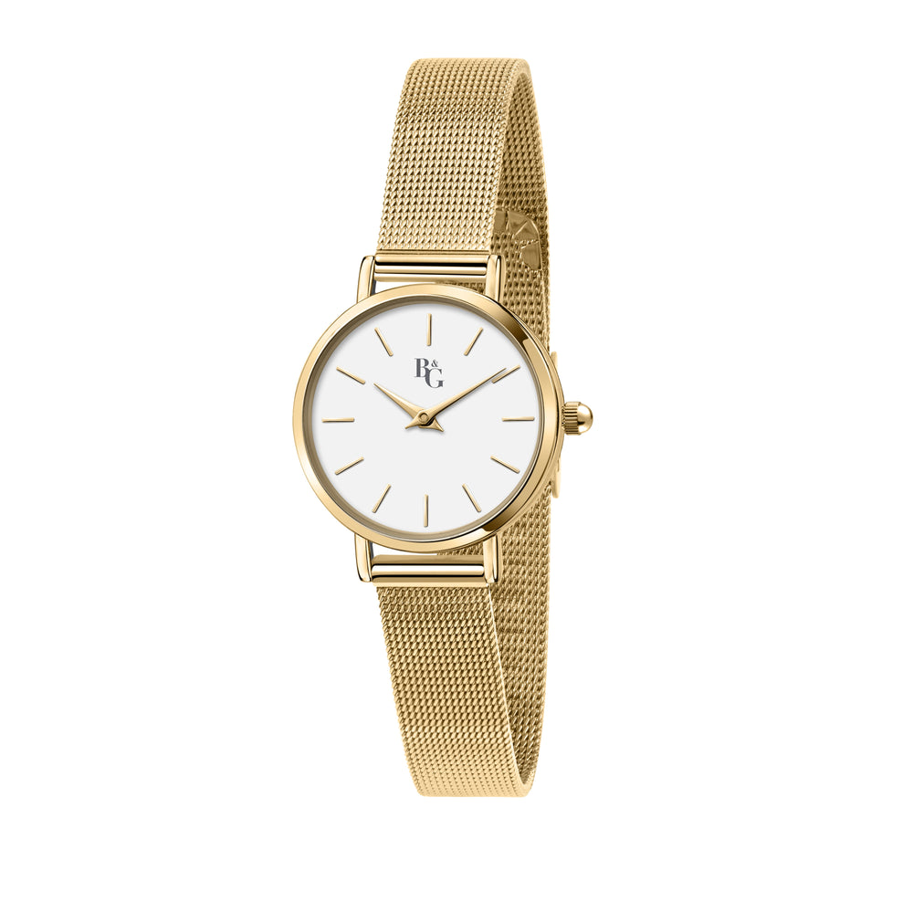 Orologio Donna B&G della collezione PREPPY. Orologio con movimento MVT. M2025, funzione Solo tempo. 2H. Quadrante: 2 lancette UPMR, finitura Lega. Lucido, colore BIANCO. Tipo cinturino: Mesh Band. Materiale cinturino: Bracciale in Metallo di colore Oro. Cassa in Vetro minerale di dimensioni 26. Chiusura: Clip e gancio. Resistenza all'acqua: Non resistente all'acqua. Peso: 38 gr. Codice prodotto: R3853252549. Colore: ORO GIALLO. Materiali: Lega. Acciaio. PVD Oro. Confezione: scatola originale B&G. Garanzia: garanzia internazionale B&G