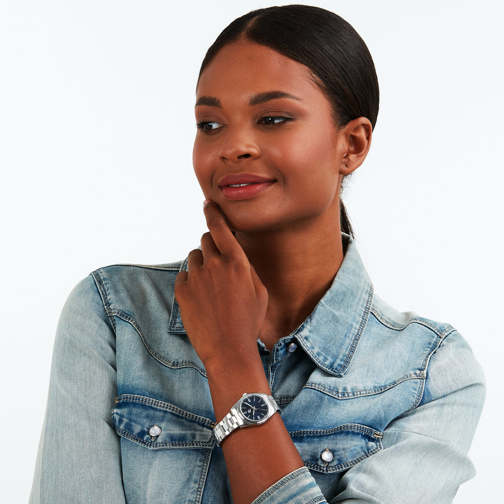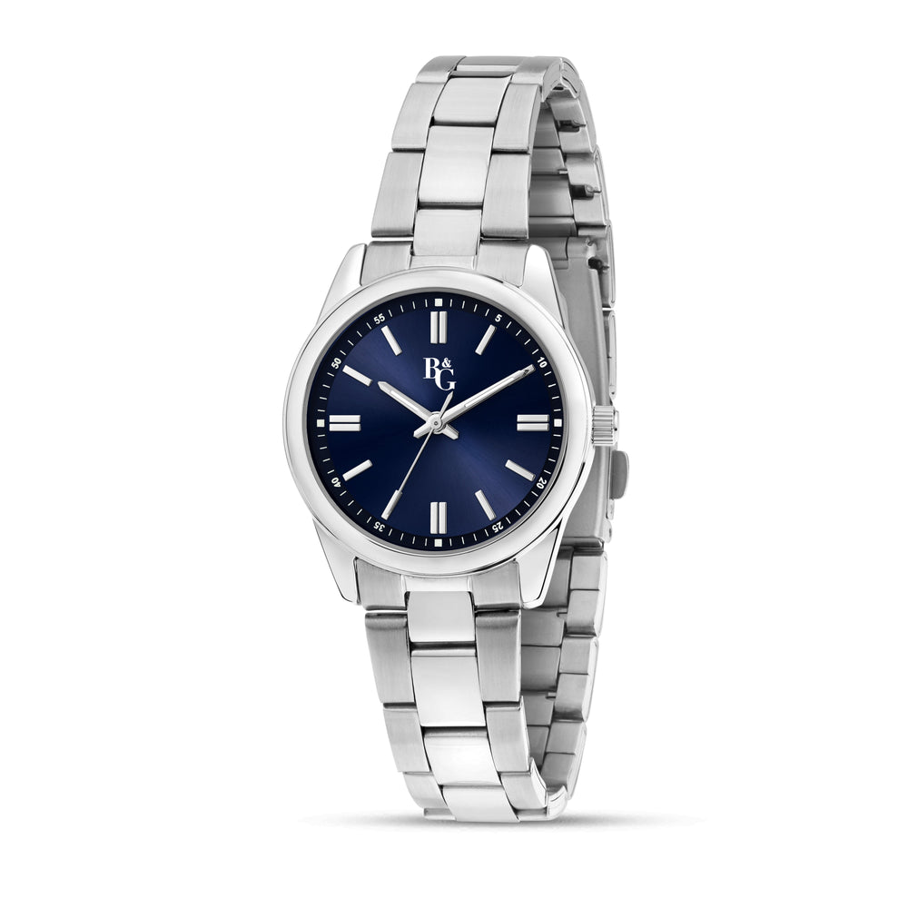 Orologio Donna B&G della collezione TIMELESS. Orologio con movimento MVT. M2035, funzione Solo tempo. 3H. Quadrante: 3 lancette indici UPMR, finitura Acciaio. lucido, colore BLU. SUNRAY. Tipo cinturino: Ribordato vero. Materiale cinturino: Bracciale in Metallo di colore Acciaio. Cassa in Vetro minerale di dimensioni 31. Chiusura: Fibbia DEPLOYANTE con pulsanti. Resistenza all'acqua: 3 ATM. Peso: 99 gr. Codice prodotto: R3853316505. Colore: ARGENTO. Materiali: Acciaio. Confezione: scatola originale B&G. Garanzia: garanzia internazionale B&G