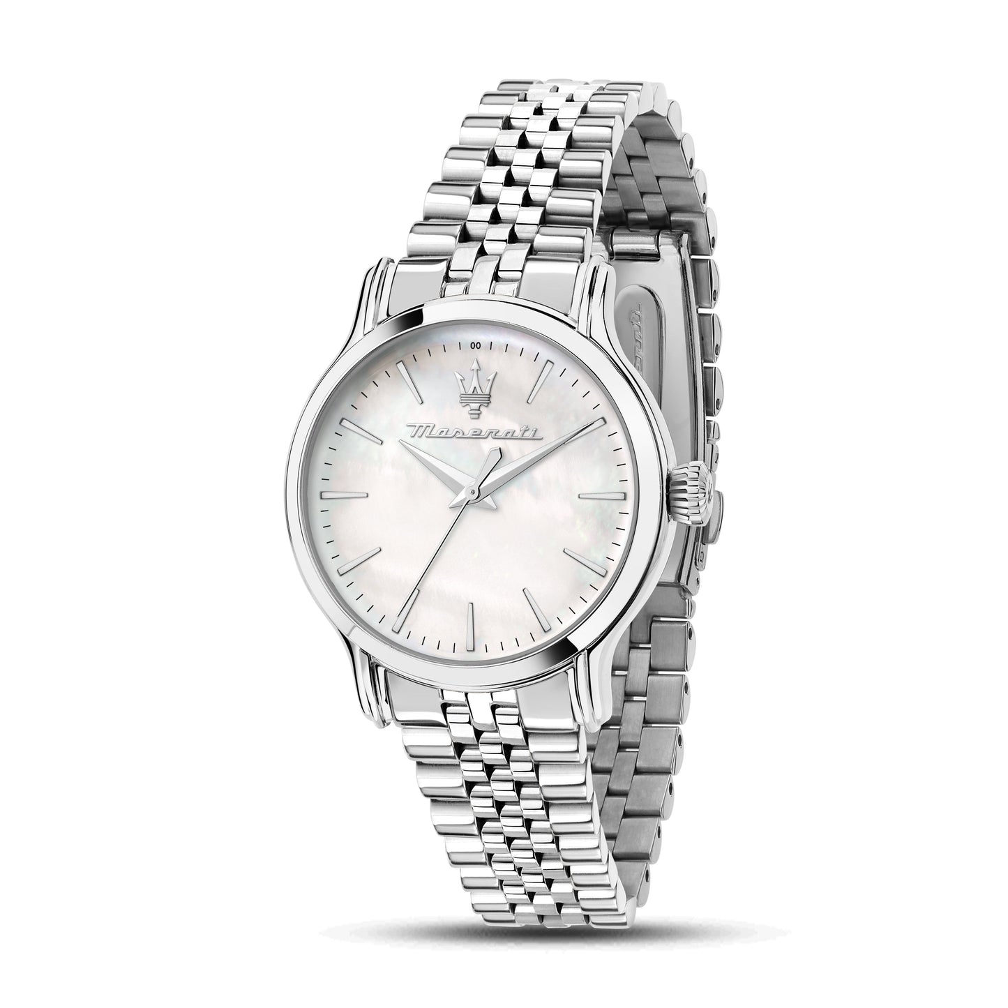 Orologio Donna Maserati Epoca R8853118521. Orologio da donna con movimento al quarzo 2035 e funzioni di solo tempo. Cassa in acciaio inox con finitura lucida dal diametro di 34 mm. Quadrante analogico in madreperla con indici a bastoni e logo a ore 12. Cinturino jubilee in acciaio anallergico color argento; chiusura deployante con pulsanti. Resistente all'acqua fino a 100 metri di profondità. Confezione: scatola originale Maserati. Garanzia: garanzia internazionale Maserati.