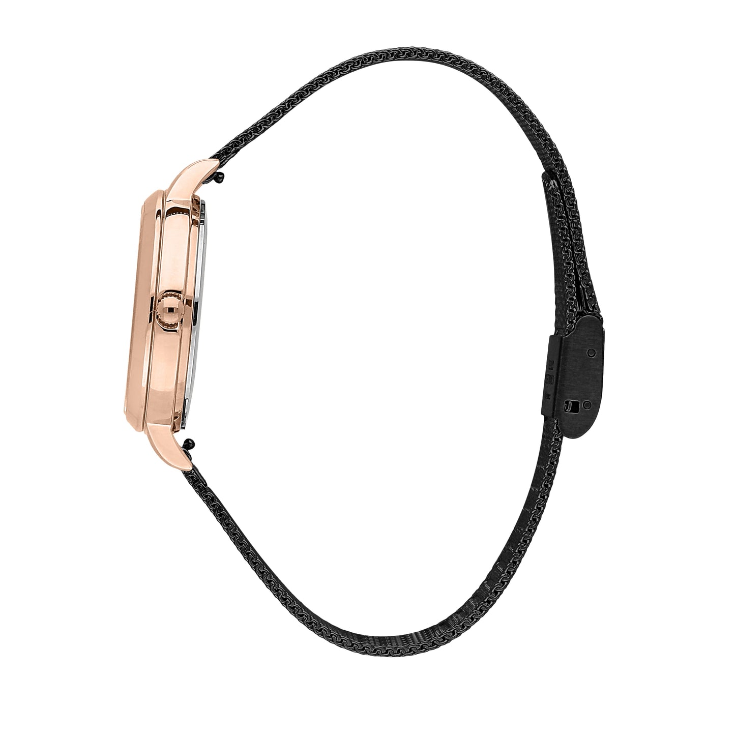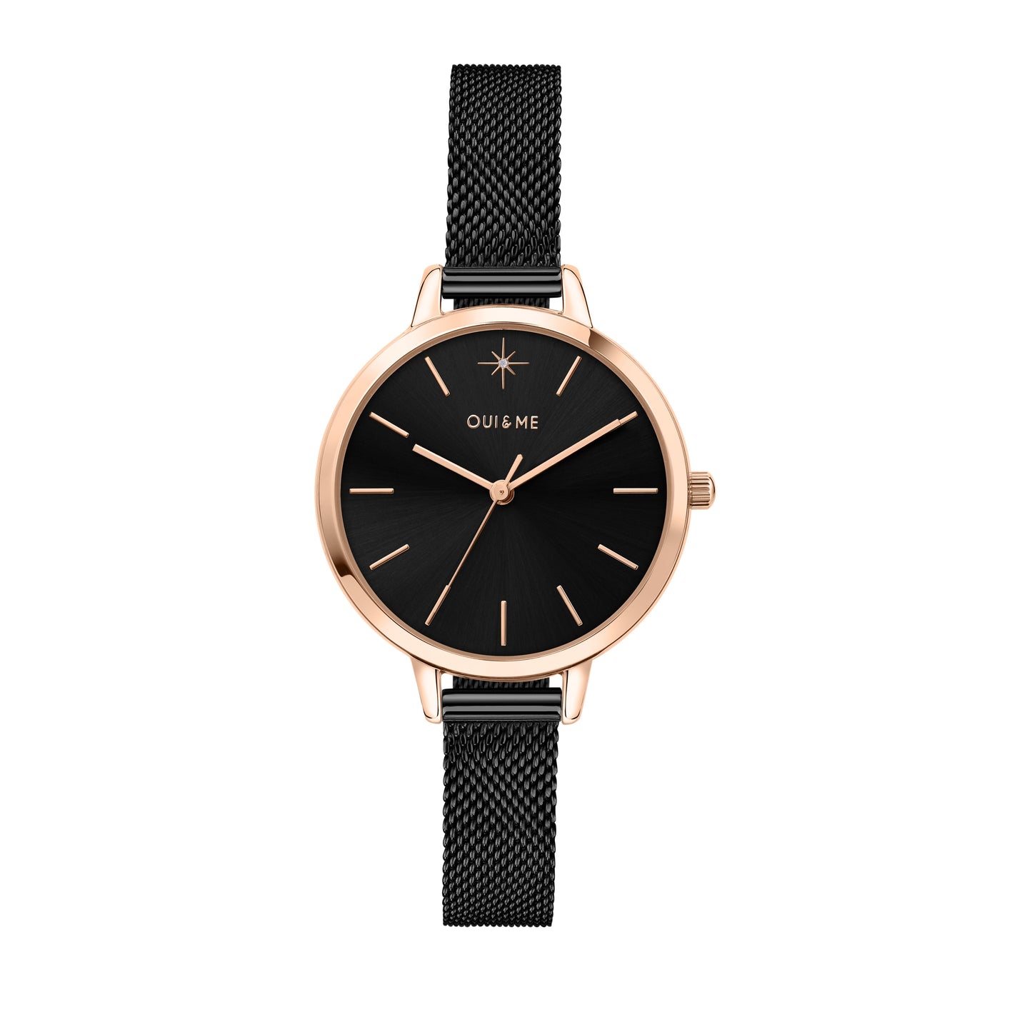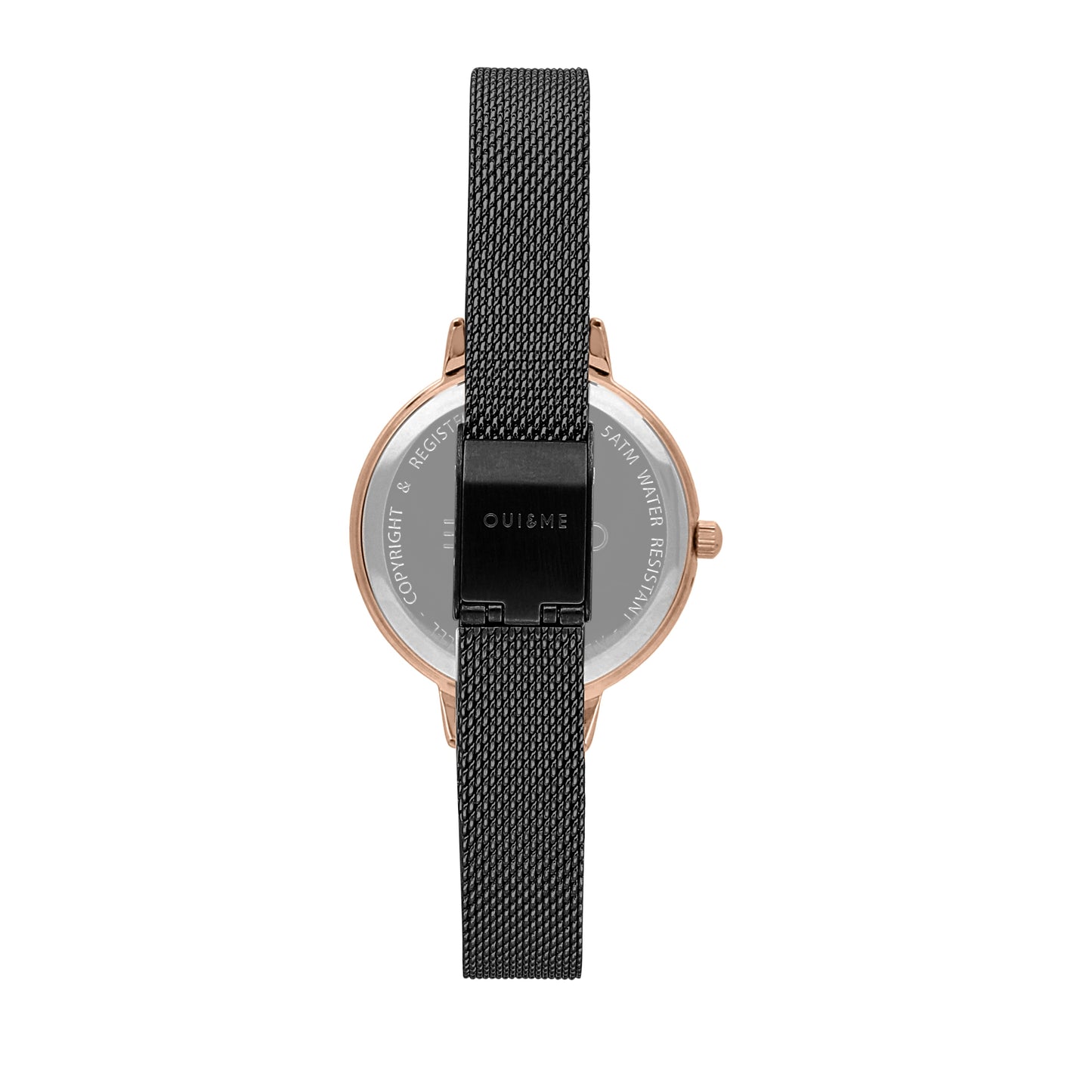 Orologio Donna OUI&ME della collezione AMOURETTE. Orologio con movimento MVT. M2035, funzione Solo tempo. 3H. Quadrante: 3 lancette indici UPMR, finitura Pvd oro rosa. Lucido, colore NERO. Tipo cinturino: Mesh Band. Materiale cinturino: Bracciale in Metallo di colore Nero. Cassa in Vetro minerale di dimensioni 32. Chiusura: Clip e gancio. Resistenza all'acqua: 5 ATM. Peso: 39,5 gr. Codice prodotto: ME010055. Materiali: Acciaio. PVD Oro rosa. Confezione: scatola originale OUI&ME. Garanzia: garanzia internazionale OUI&ME