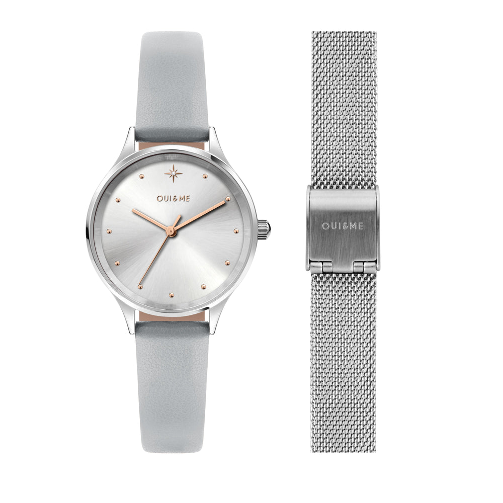 Orologio Donna OUI&ME della collezione BICHETTE. Orologio con movimento MVT VJ21, funzione Solo tempo. 3H. Quadrante: 3 lancette UPMR indici/punti oro rosa, finitura Acciaio. lucido, colore ARGENTO. Tipo cinturino: Tranciato. Materiale cinturino: Bracciale in Pelle di colore Grigio. Cassa in Vetro minerale di dimensioni 28. Chiusura: Fibbia ARDIGLIONE. Resistenza all'acqua: 5 ATM. Peso: 30,6 gr. Codice prodotto: ME010168. Materiali: Acciaio. Pelle naturale. Confezione: scatola originale OUI&ME. Garanzia: garanzia internazionale OUI&ME