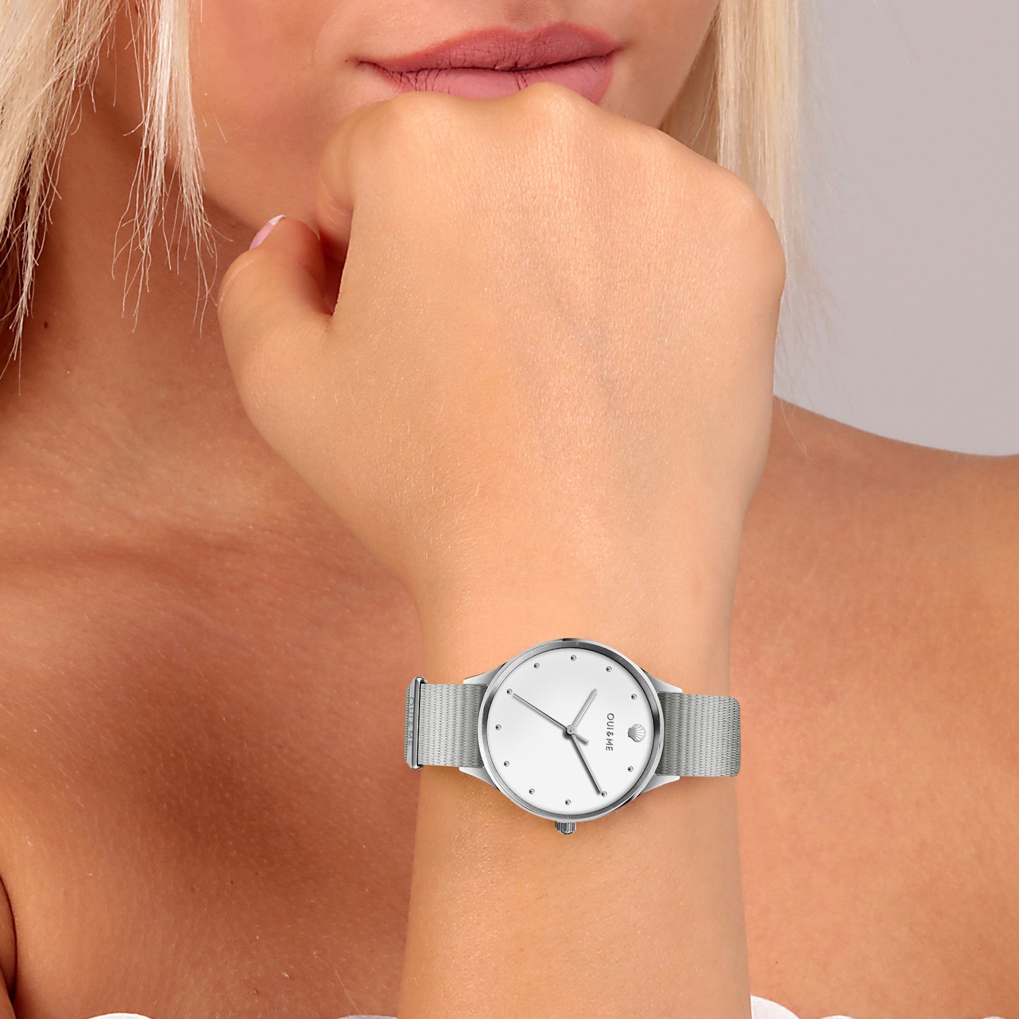 Orologio Donna OUI&ME della collezione BICHETTE. Orologio con movimento MVT VJ21, funzione Solo tempo. 3H. Quadrante: 3 lancette indici, finitura Acciaio. lucido, colore BIANCO. Tipo cinturino: Tranciato. Materiale cinturino: Tessuto di colore Grigio. Cassa in Vetro minerale di dimensioni 32. Chiusura: Fibbia ARDIGLIONE. Resistenza all'acqua: 5 ATM. Peso: 73,4 gr. Codice prodotto: ME010200. Materiali: Acciaio. Tessuto. Confezione: scatola originale OUI&ME. Garanzia: garanzia internazionale OUI&ME
