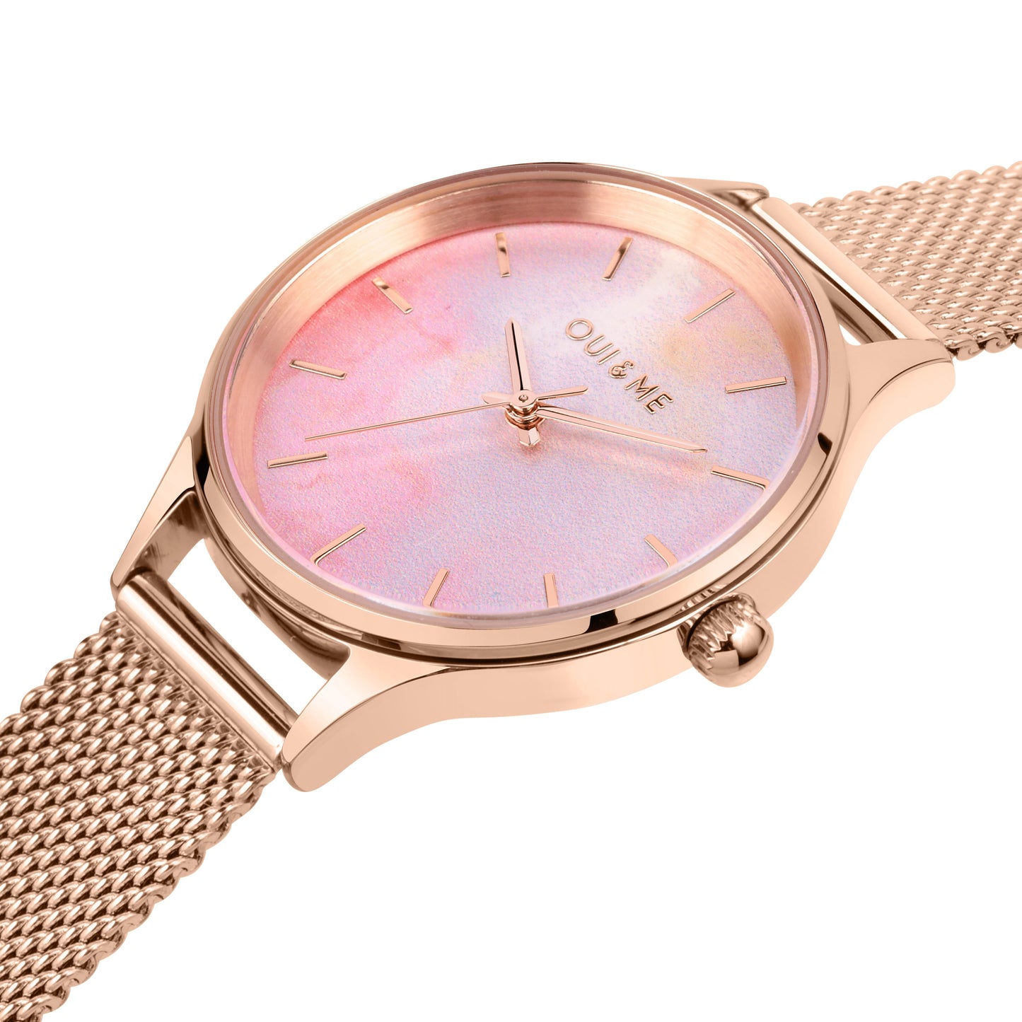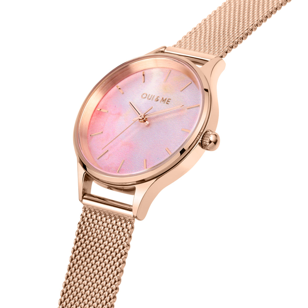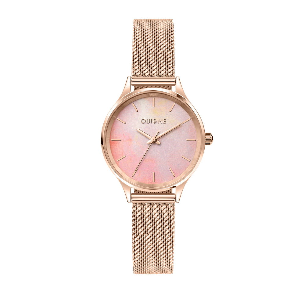 Orologio Donna OUI&ME della collezione BICHETTE. Orologio con movimento MVT VJ21, funzione Solo tempo. 3H. Quadrante: 3 lancette UPMR a ore 1-12, finitura Pvd oro rosa. Lucido, colore ROSA. BRILLANTE. Tipo cinturino: Mesh Band. Materiale cinturino: Bracciale in Metallo di colore Oro Rosa. Cassa in Vetro minerale di dimensioni 28. Chiusura: Clip e gancio. Resistenza all'acqua: 5 ATM. Peso: 44,7 gr. Codice prodotto: ME010272. Materiali: Acciaio. PVD Oro rosa. Confezione: scatola originale OUI&ME. Garanzia: garanzia internazionale OUI&ME