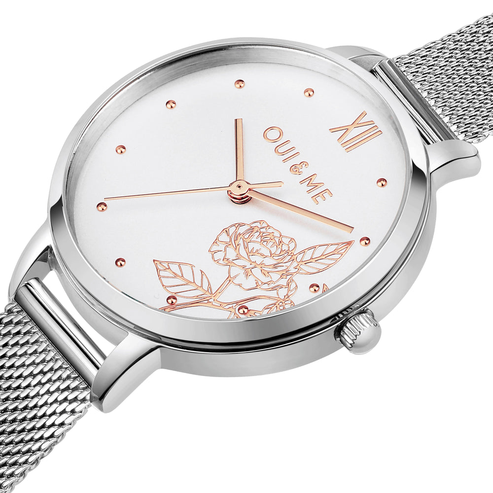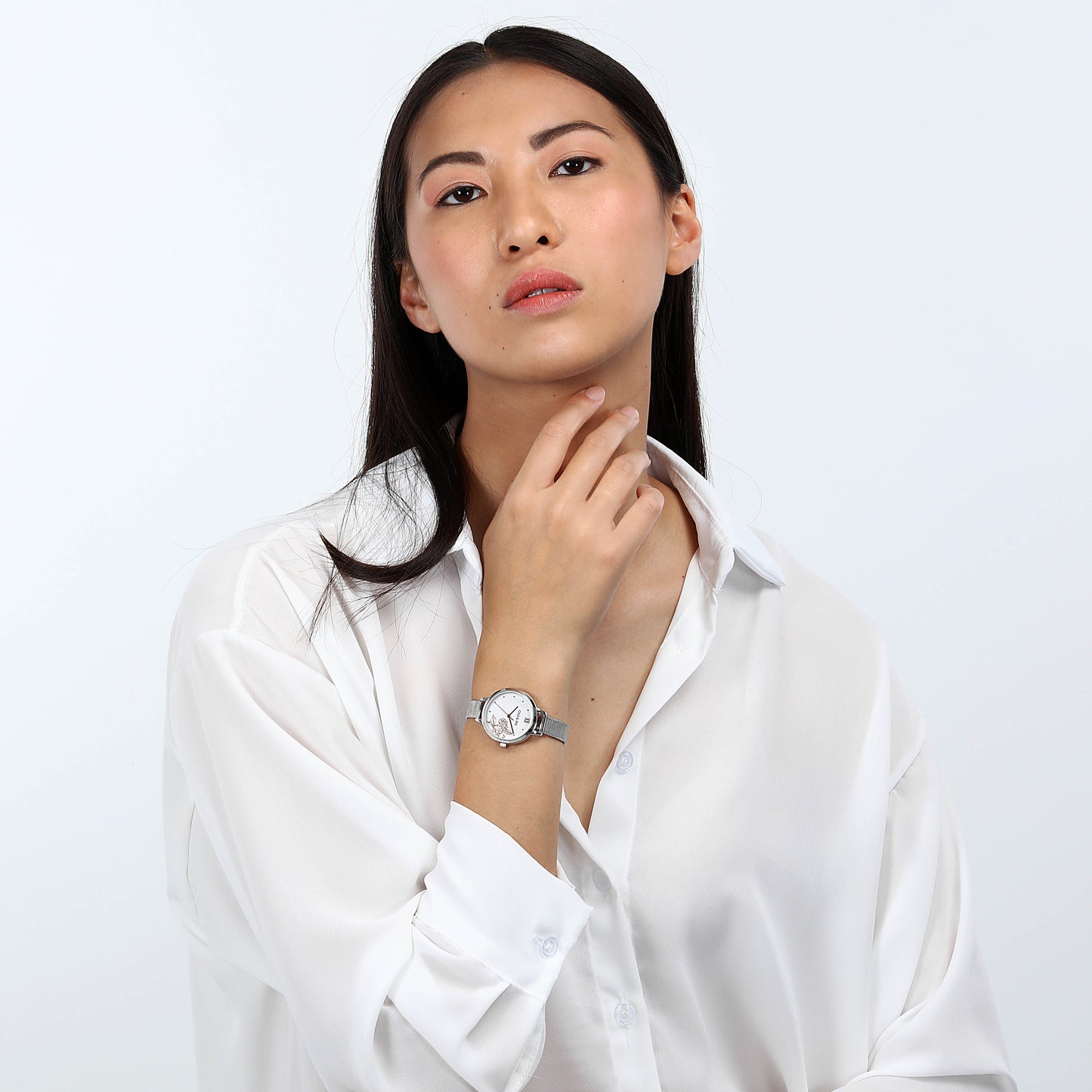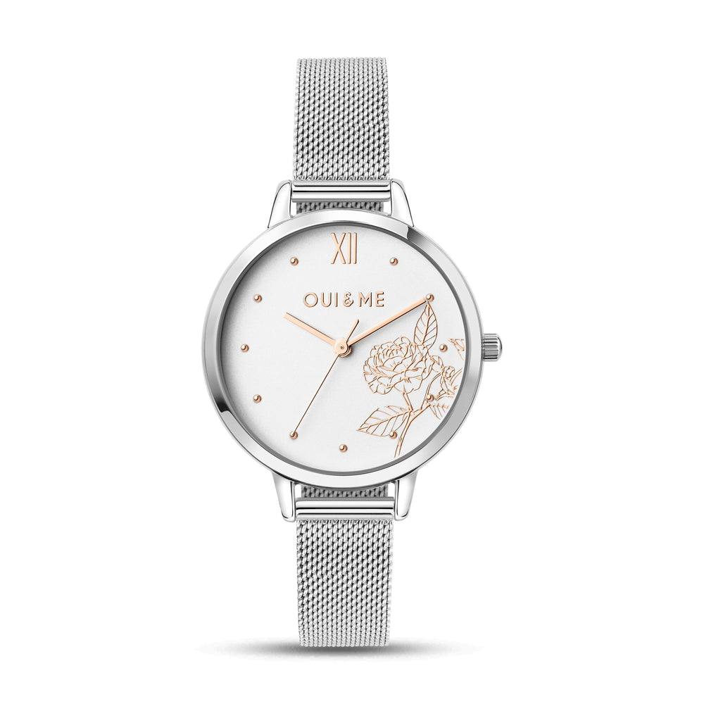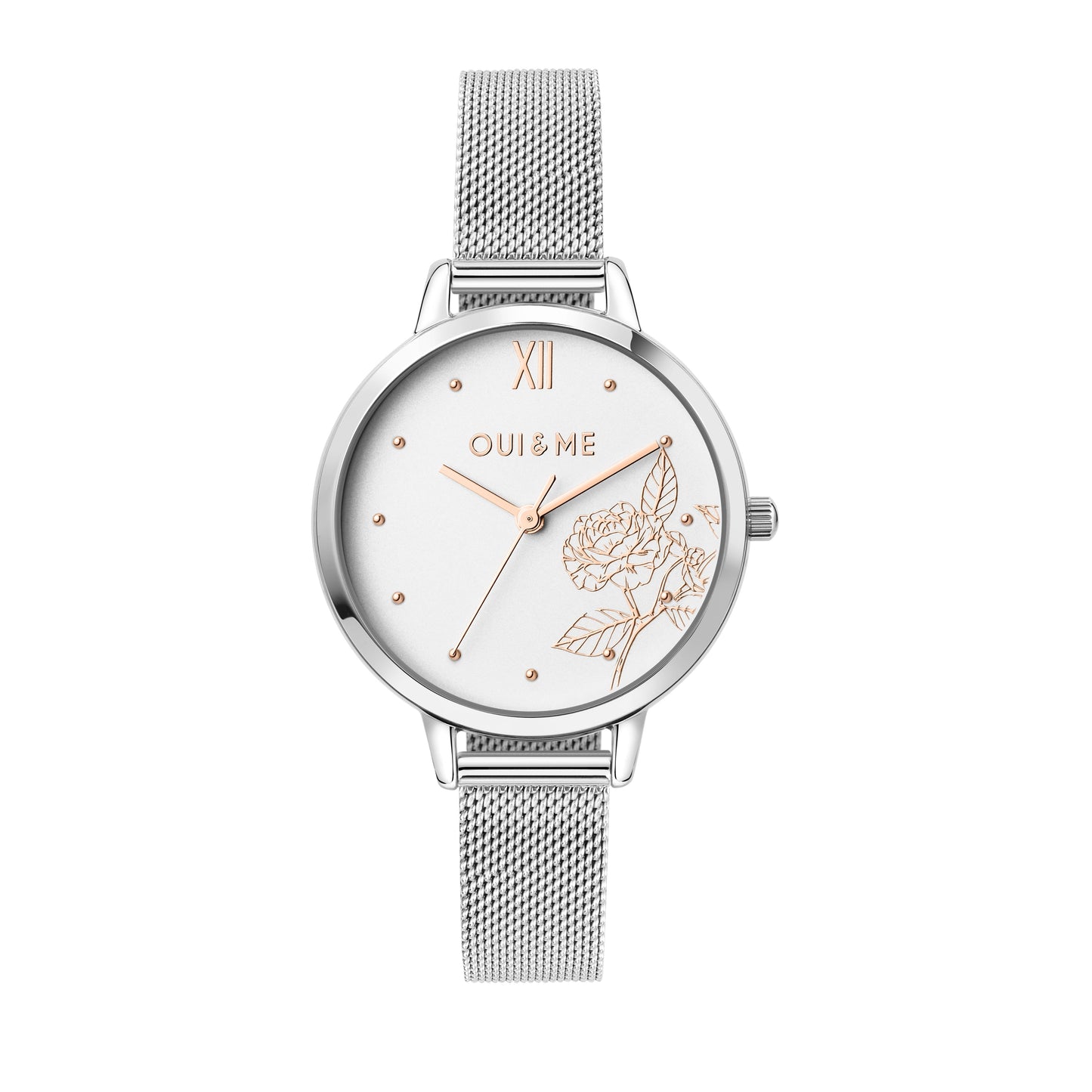Orologio Donna OUI&ME della collezione FLEURETTE. Orologio con movimento MVT. M2035, funzione Solo tempo. 3H. Quadrante: 3 lancette indici, finitura Acciaio. lucido, colore BIANCO. Tipo cinturino: Mesh Band. Materiale cinturino: Bracciale in Metallo di colore Acciaio. Cassa in Vetro minerale di dimensioni 32. Chiusura: Clip e gancio. Resistenza all'acqua: 5 ATM. Peso: 37,5 gr. Codice prodotto: ME010330. Colore: ARGENTO. Materiali: Acciaio riciclato. Confezione: scatola originale OUI&ME. Garanzia: garanzia internazionale OUI&ME