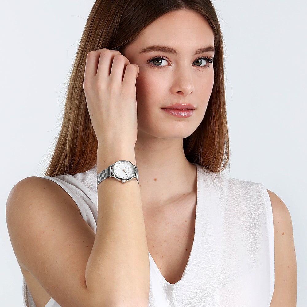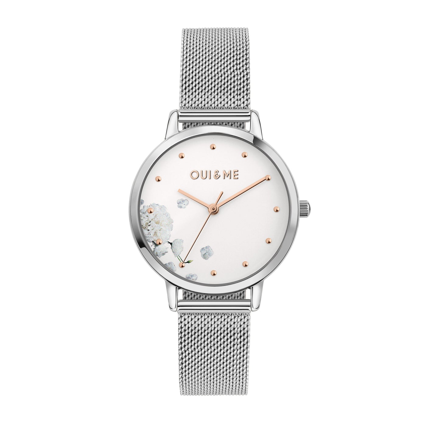 Orologio Donna OUI&ME della collezione FLEURETTE. Orologio con movimento MVT. M2035, funzione Solo tempo. 3H. Quadrante: 3 lancette indici/stampato 3D, finitura Acciaio. lucido, colore BIANCO. SABBIATO. Tipo cinturino: Mesh Band. Materiale cinturino: Bracciale in Metallo di colore Acciaio. Cassa in Vetro minerale di dimensioni 32. Chiusura: Clip e gancio. Resistenza all'acqua: 5 ATM. Peso: 49,48 gr. Codice prodotto: ME010375. Colore: ARGENTO. Materiali: Acciaio riciclato. Confezione: scatola originale OUI&ME. Garanzia: garanzia internazionale OUI&ME