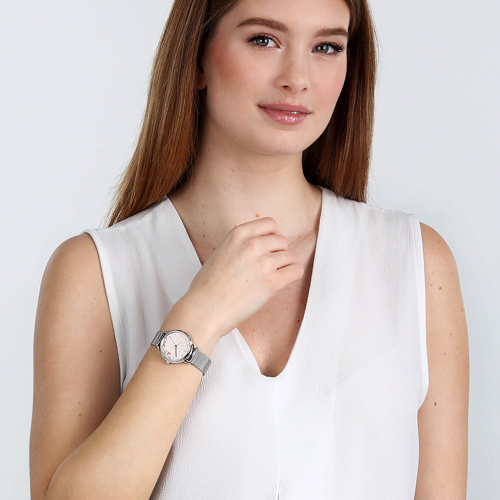 Orologio Donna OUI&ME della collezione FLEURETTE. Orologio con movimento MVT. M2035, funzione Solo tempo. 3H. Quadrante: 3 lancette indici/stampato 3D, finitura Acciaio. lucido, colore ORO ROSA. OPACO. Tipo cinturino: Mesh Band. Materiale cinturino: Bracciale in Metallo di colore Acciaio. Cassa in Vetro minerale di dimensioni 32. Chiusura: Clip e gancio. Resistenza all'acqua: 5 ATM. Peso: 49,48 gr. Codice prodotto: ME010376. Colore: ARGENTO. Materiali: Acciaio riciclato. Confezione: scatola originale OUI&ME. Garanzia: garanzia internazionale OUI&ME