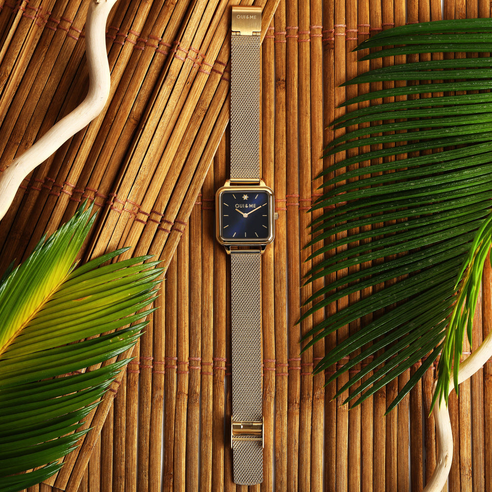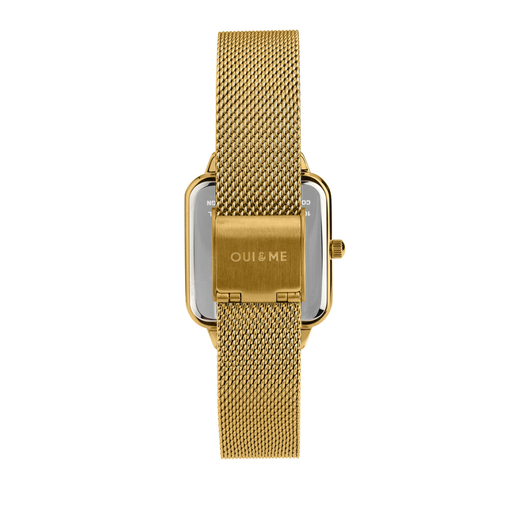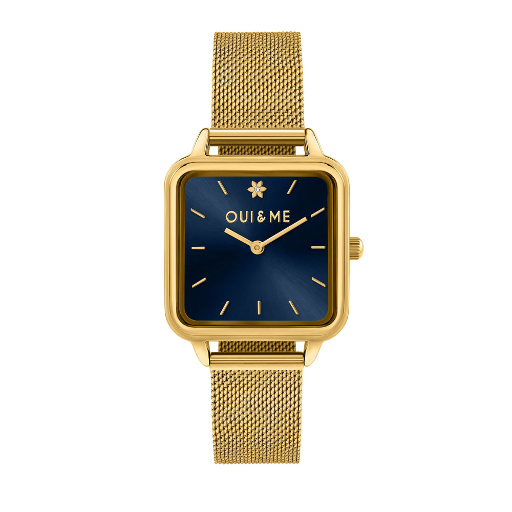 Orologio Donna OUI&ME della collezione HARMONIE. Orologio con movimento MVT. M2025, funzione Solo tempo. 2H. Quadrante: 2 lancette UPMR indici e indici di pietra, finitura Acciaio. lucido, colore BLU. SUNRAY. Tipo cinturino: Mesh Band. Materiale cinturino: Bracciale in Metallo di colore Oro. Cassa in Vetro minerale di dimensioni 36.20x27.50. Chiusura: Clip e gancio. Resistenza all'acqua: 3 ATM. Peso: 50 gr. Codice prodotto: ME010381. Colore: ORO GIALLO. Materiali: Acciaio riciclato. Confezione: scatola originale OUI&ME. Garanzia: garanzia internazionale OUI&ME