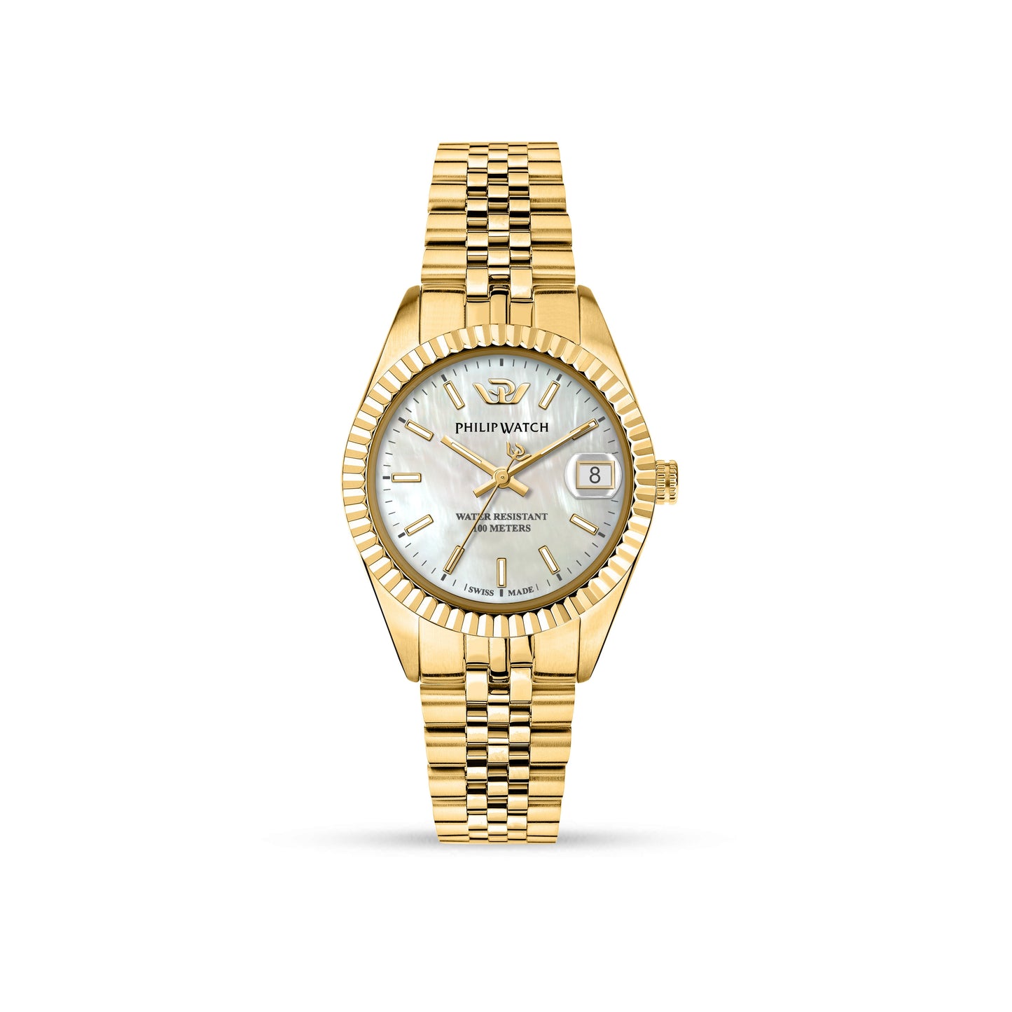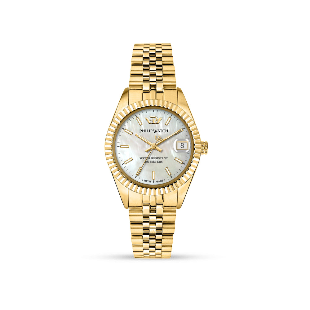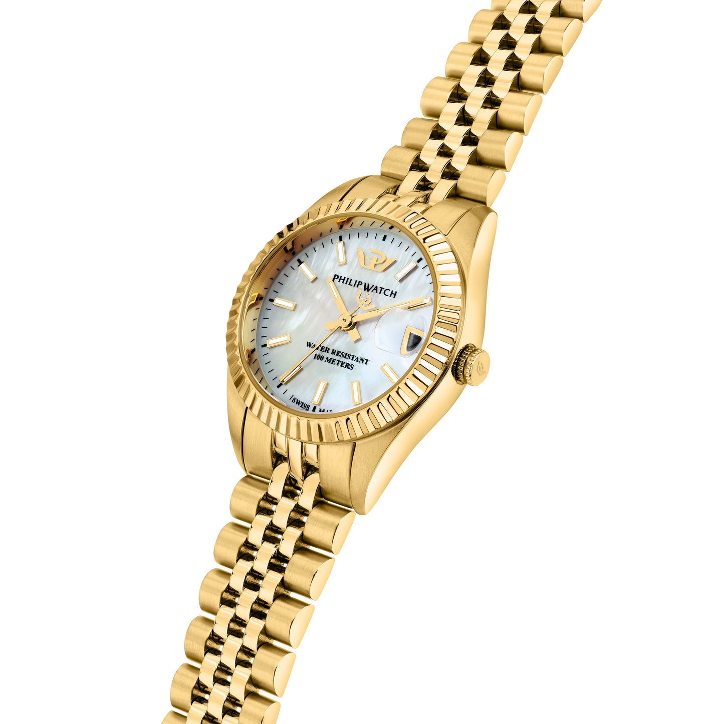 Orologio Donna PHILIP WATCH della collezione CARIBE URBAN. Orologio con movimento MVT. F04.115, funzione tempo e data. Quadrante: 3 Lancette indici applicati con/datario a ore 3, finitura Lucido e satinato, colore BIANCO. Tipo cinturino: Solid. Materiale cinturino: Bracciale in Metallo di colore Oro. Cassa in Vetro zaffiro. trattamento antiriflesso di dimensioni 28. Chiusura: Fibbia FARFALLA con pulsanti. Resistenza all'acqua: 10 ATM. Peso: 76,14 gr. Codice prodotto: R8253597650. Colore: ORO GIALLO. Materiali: Acciaio. Confezione: scatola originale PHILIP WATCH. Garanzia: garanzia internazionale PHILIP WATCH