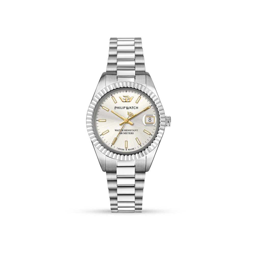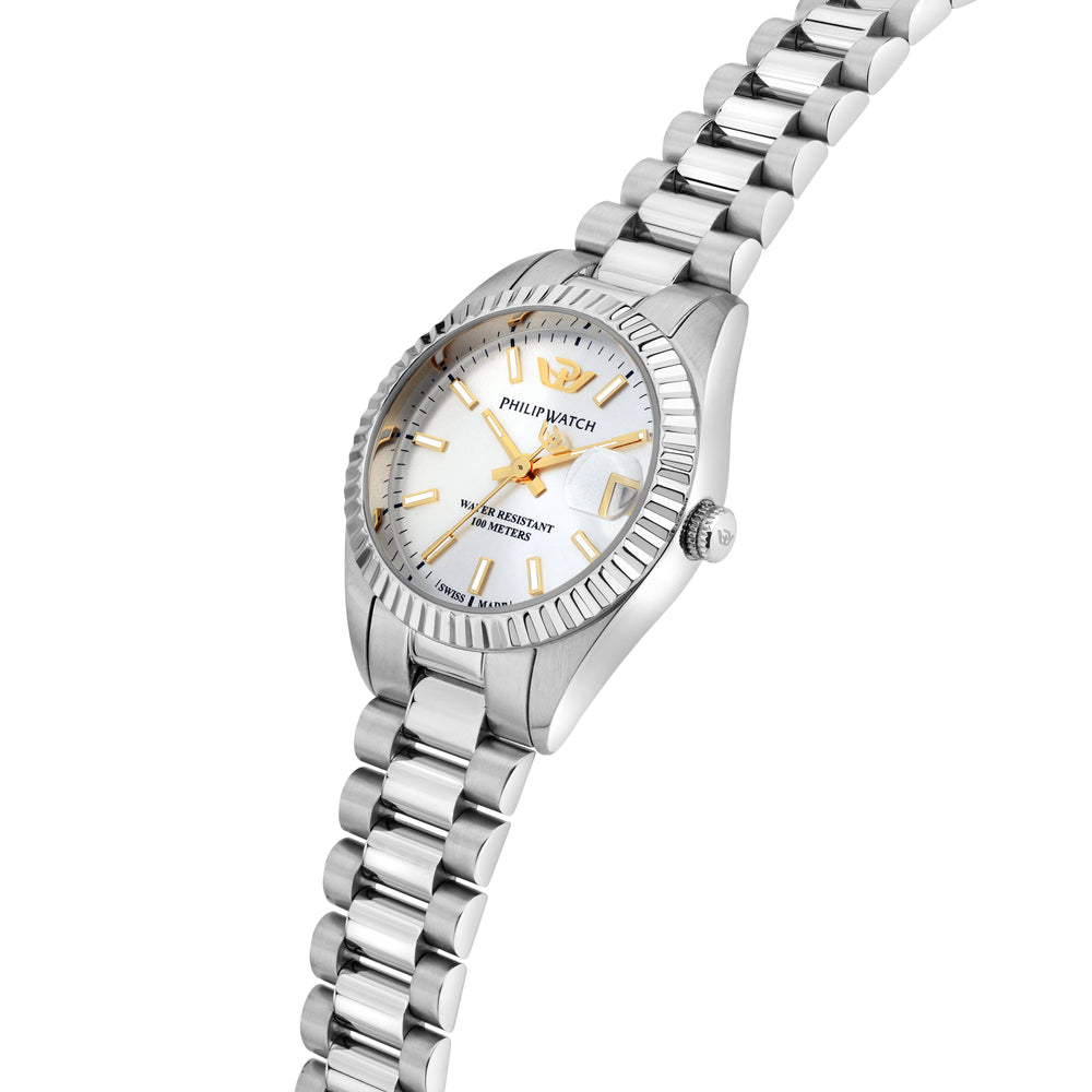 Orologio Donna PHILIP WATCH della collezione CARIBE URBAN. Orologio con movimento MVT. F04.115, funzione tempo e data. Quadrante: 3 Lancette indici applicati con/datario a ore 3, finitura Lucido e satinato, colore BIANCO. SUNRAY. Tipo cinturino: Solid. Materiale cinturino: Bracciale in Metallo di colore Acciaio. Cassa in Vetro zaffiro. trattamento antiriflesso di dimensioni 28. Chiusura: Fibbia FARFALLA con pulsanti. Resistenza all'acqua: 10 ATM. Peso: 76,88 gr. Codice prodotto: R8253597651. Colore: ARGENTO. Materiali: Acciaio. Confezione: scatola originale PHILIP WATCH. Garanzia: garanzia internazionale PHILIP WATCH