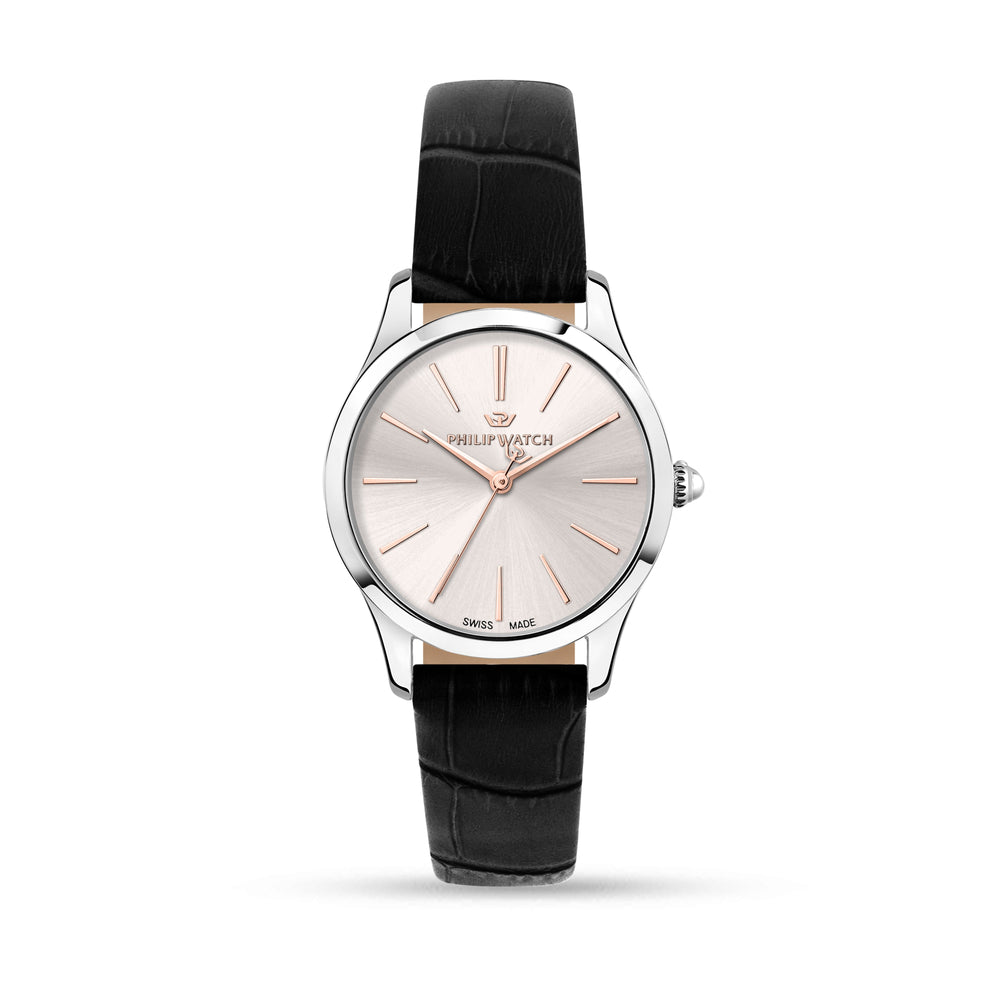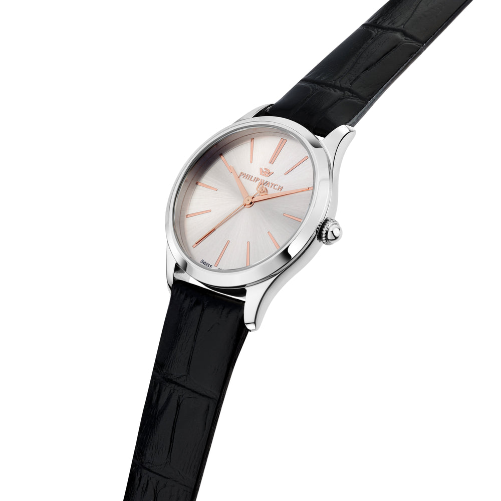 Orologio Donna Philip Watch Grace R8251208502. Materiale e finitura cassa: Acciaio, Pelle, Misura cassa: 32mm, Spessore cassa: 8,25, Finitura cassa: Lucido, Colore cassa: Silver, Vetro: Vetro zaffiro antiriflesso, Materiale cinturino: Pelle, Colore cinturino: Nero, Chiusura: Fibbia ardiglione, Movimento al quarzo, funzione solo tempo, Swiss made: Sì, Water resistant: 10 atm, Garanzia: Ufficiale 2 anni Philip Watch, Confezione: Originale Philip Watch