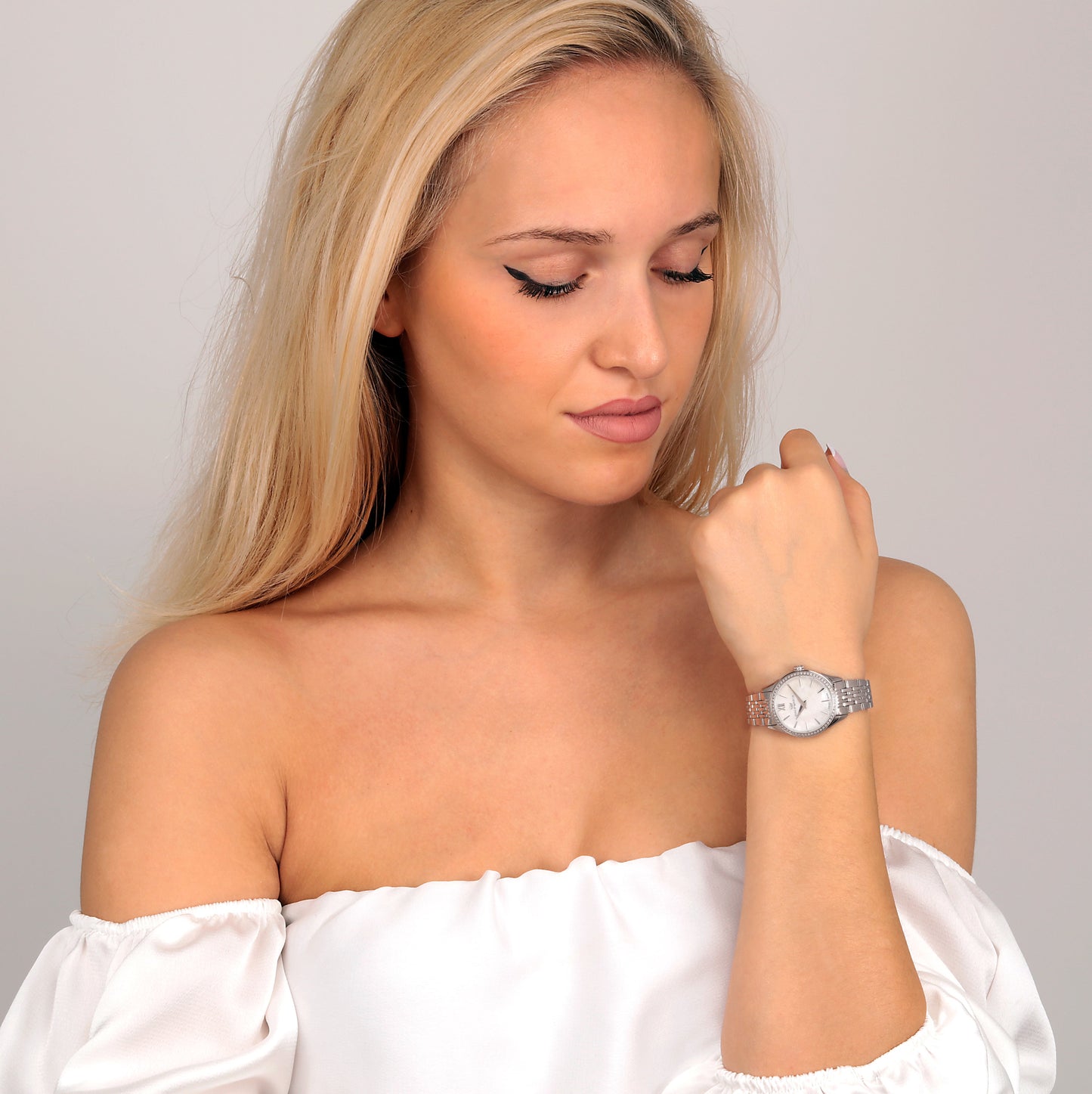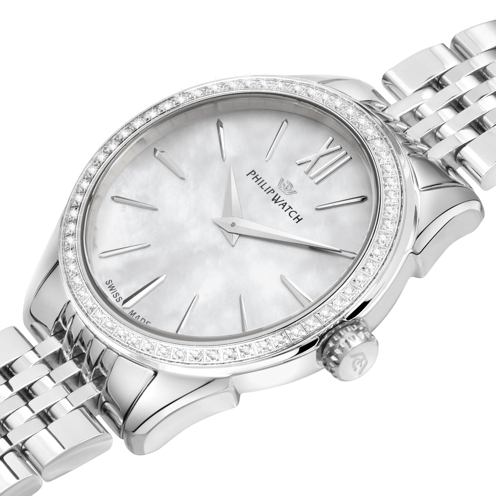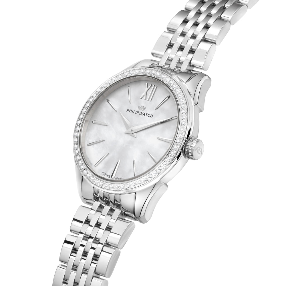 Orologio Donna Philip Watch Roma R8253217506. Orologio Philip Watch da donna con movimento al quarzo RONDA 1032 e funzioni di solo tempo. Cassa rotonda in acciaio inox dal diametro di 28 mm. Lunetta con diamanti. Quadrante in madreperla con indici a bastoni. Vetro zaffiro antiriflesso. Cinturino in acciaio anallergico; chiusura deployante con pulsanti. Cinturino addizionale in pelle rossa con stampa coccodrillo. Resistente all'acqua fino a 50 metri di profondità. Confezione: scatola originale PHILIP WATCH. Garanzia: garanzia internazionale PHILIP WATCH.
