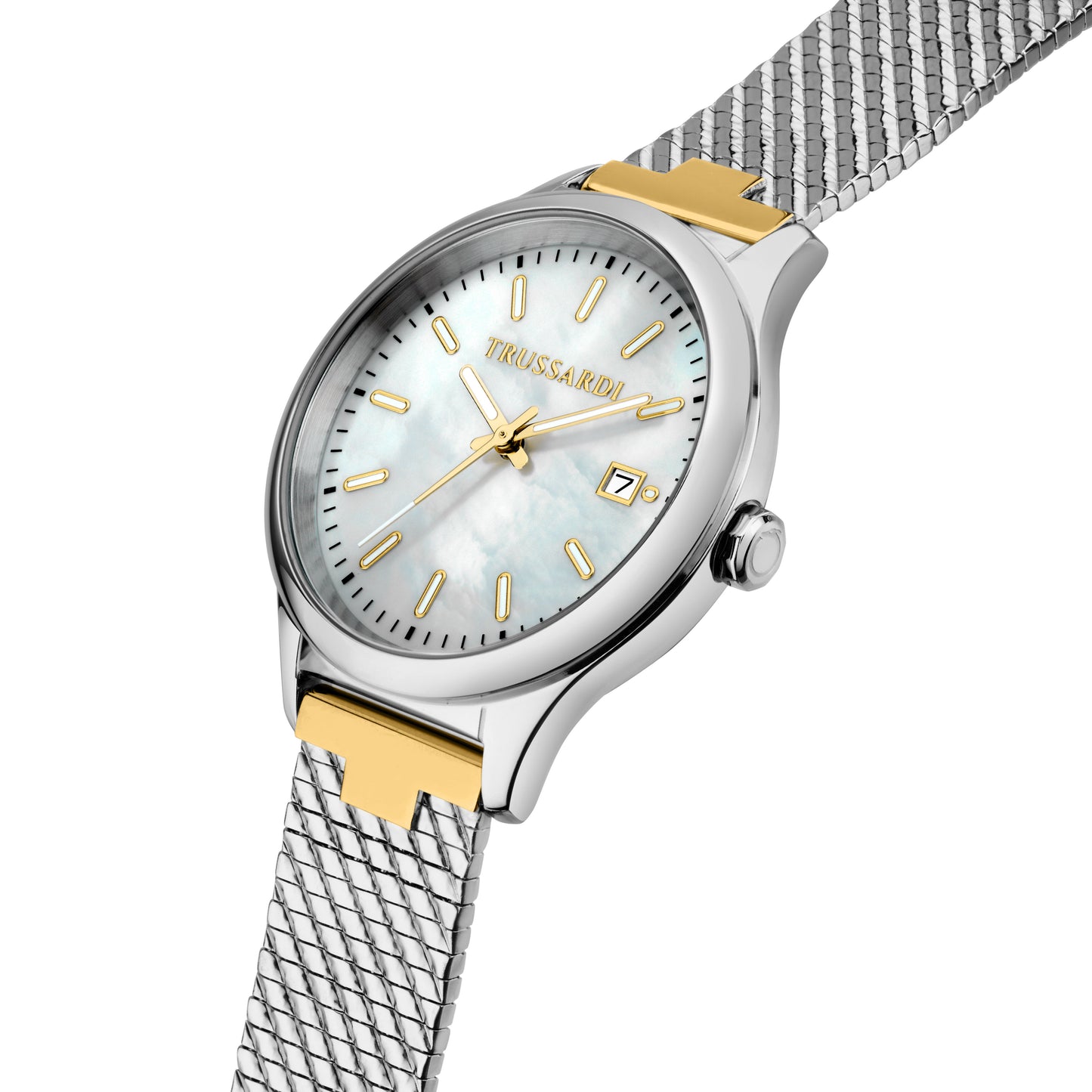 OROLOGIO DONNA TRUSSARDI CITY LIFE R2453170503. Orologio Tempo, Data con movimento MVT. MIYOTA 2115. Colore: ARGENTO. Materiali: Acciaio. Quadrante in Vetro minerale di colore BIANCO con 3 lancette indici UPMR c/datario a ore 3, finitura in Acciaio. lucido. Dimensioni cassa: 35. Cinturino in Acciaio di tipo Mesh Band e di colore Oro, Acciaio. Chiusura: Fibbia DEPLOYANTE con pulsanti. Confezione: scatola originale TRUSSARDI. Prodotto con garanzia internazionale TRUSSARDI.